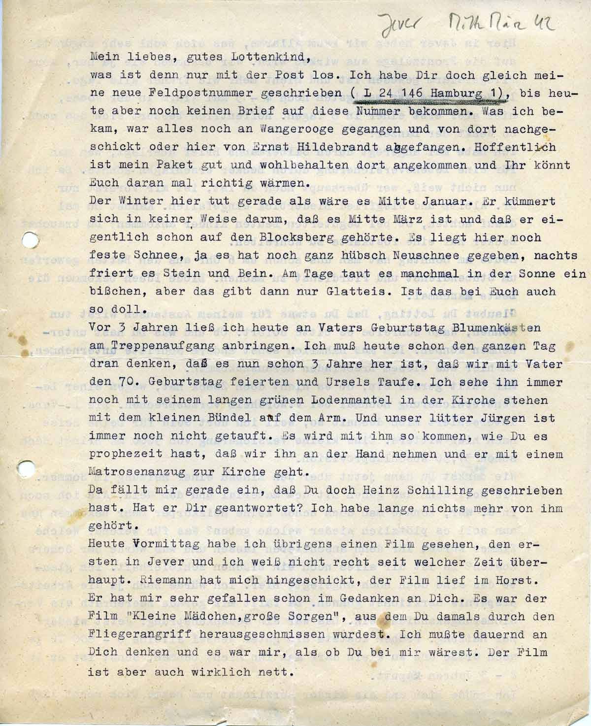 Heute Vormittag habe ich übrigens einen Film gesehen, den ersten in Jever und ich weiß nicht recht seit welcher Zeit überhaupt. Riemann hat mich hingeschickt, der Film lief im Horst. Er hat mir sehr gefallen schon in Gedanken an Dich Es war der Film „“Kleine Mädchen, große Sorgen“ , aus dem Du damals durch den Fliegerangriff herausgeschmissen wurdest. Ich mußte dauernd an Dich denken und es war mir, als ob Du bei mir wärest. Der Film ist aber auch wirklich nett.