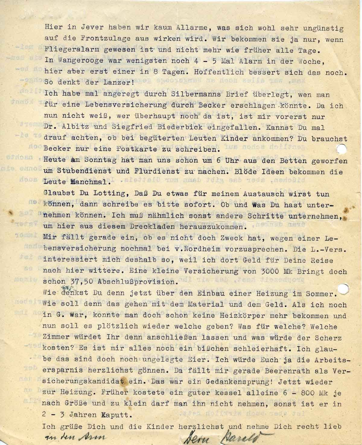 Hier in Jever haben wir kaum Allarme, was sich wohl sehr ungünstig auf die Frontzulage auswirken wird. Wir bekommen Sie ja nur, wenn Fliegeralarm gewesen ist und nicht mehr wie früher alle Tage. In Wangerooge war wenigstens noch 4-5 mal Alarm in der Woche, hier aber erst einer in 8 Tagen. Hoffentlich bessert sich das noch. So denkt der Lanzer!