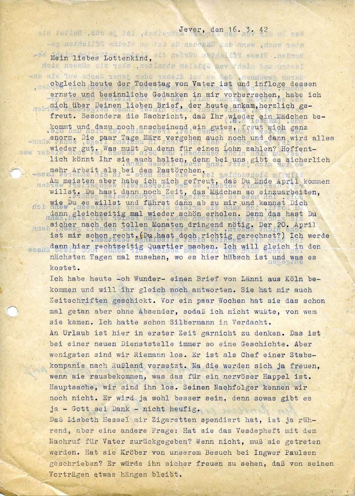 obgleich heute der Todestag von Vater ist und infolgedessen ernste und besinnliche Gedanken in mir vorherrschen, habe ich mich über Deinen lieben Brief, der heute ankam, herzlich gefreut. Besonders die Nachricht, daß Ihr wieder ein Mädchen bekommt und dazu noch anscheinend ein gutes, freut mich ganz enorm. Die paar Tage März vergehen auch noch und dann wird alles wieder gut. Was mußt Du denn für einen Lohn zahlen? Hoffentlich könnt Ihr sie auch halten, denn bei uns gibt es sicherlich mehr Arbeit als bei dem Pastörchen.