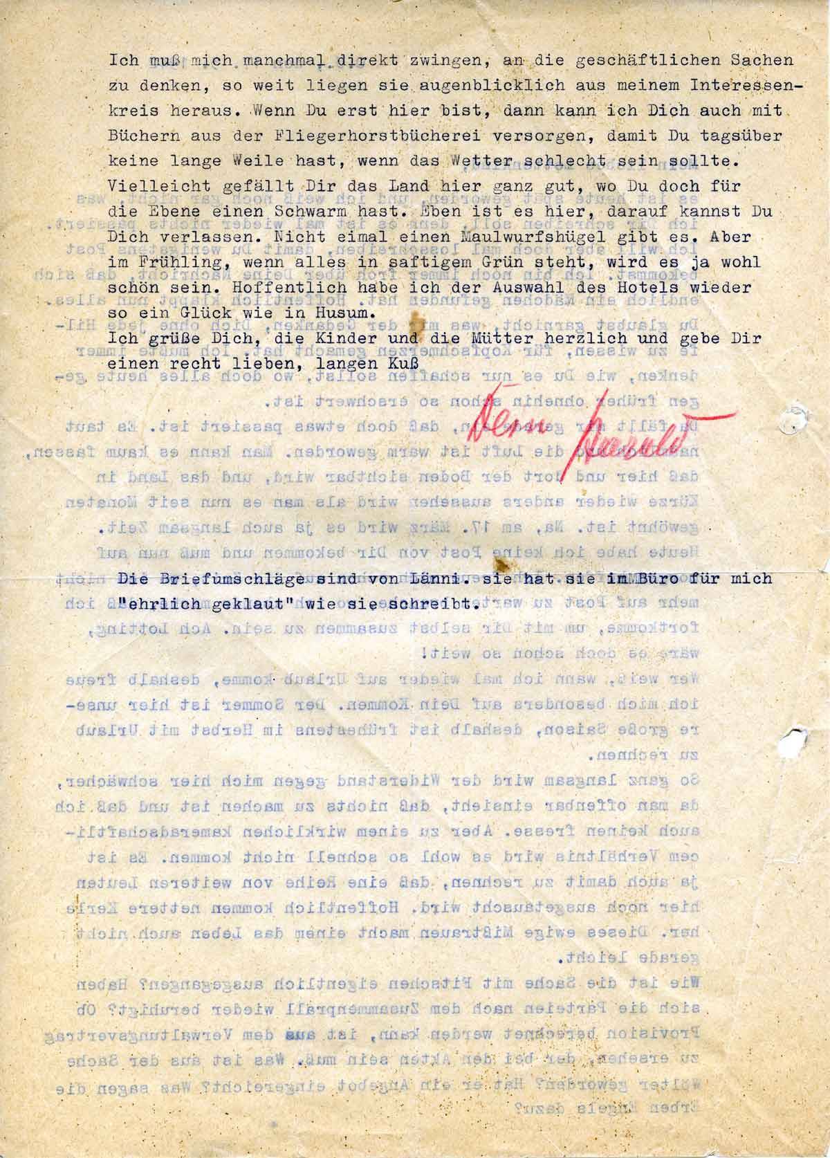 Ich muß mich manchmal direkt zwingen, an die geschäftlichen Sachen zu denken, so weit liegen sie augenblicklich aus meinen Interessenkreis heraus. Wenn Du erst hier bist, dann kann ich Dich auch mit Büchern aus der Fliegerhorstbücherei versorgen, damit Du tagsüber keine lange Weile hast, wenn das Wetter schlecht sein sollte. Vielleicht gefällt Dir das Land hier ganz gut, wo du doch für die Ebene einen Schwarm hast. Eben ist es hier, darauf kannst Du Dich verlassen. Nicht einmal einen Maulwurfshügel gibt es. Aber im Frühling, wenn alles in saftigem Grün steht, wird es ja wohl schön sein. Hoffentlich habe ich (in) der Auswahl des Hotels wieder so ein Glück wie in Husum.