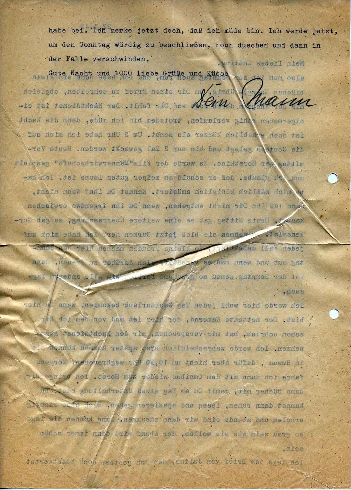 Ich werde hier wohl jeden Tag Nachturlaub bekommen, wenn Du hier bist. Der netteste Kamerad, der hier ist und von dem ich Dir auch schrieb, hat mir versprochen, mir den Nachtdienst abzunehmen. Ich werde wahrscheinlich erst später kommen können als in Husum, dafür aber nicht um 10,30 Uhr wegbrauchen. Morgens fahre ich dann mit dem Omnibus wieder zum Horst. Ich bringe Dir dann Bücher mit, damit Du am Tag etwas Unterhaltung hast. Du kannst dann ruhig lesen und spazieren gehen, Dich also richtig erholen und abends sind wir dann zusammen. Dann können die Tage so grau sein, wie sie wollen, der Abend wird dann immer schön sein.