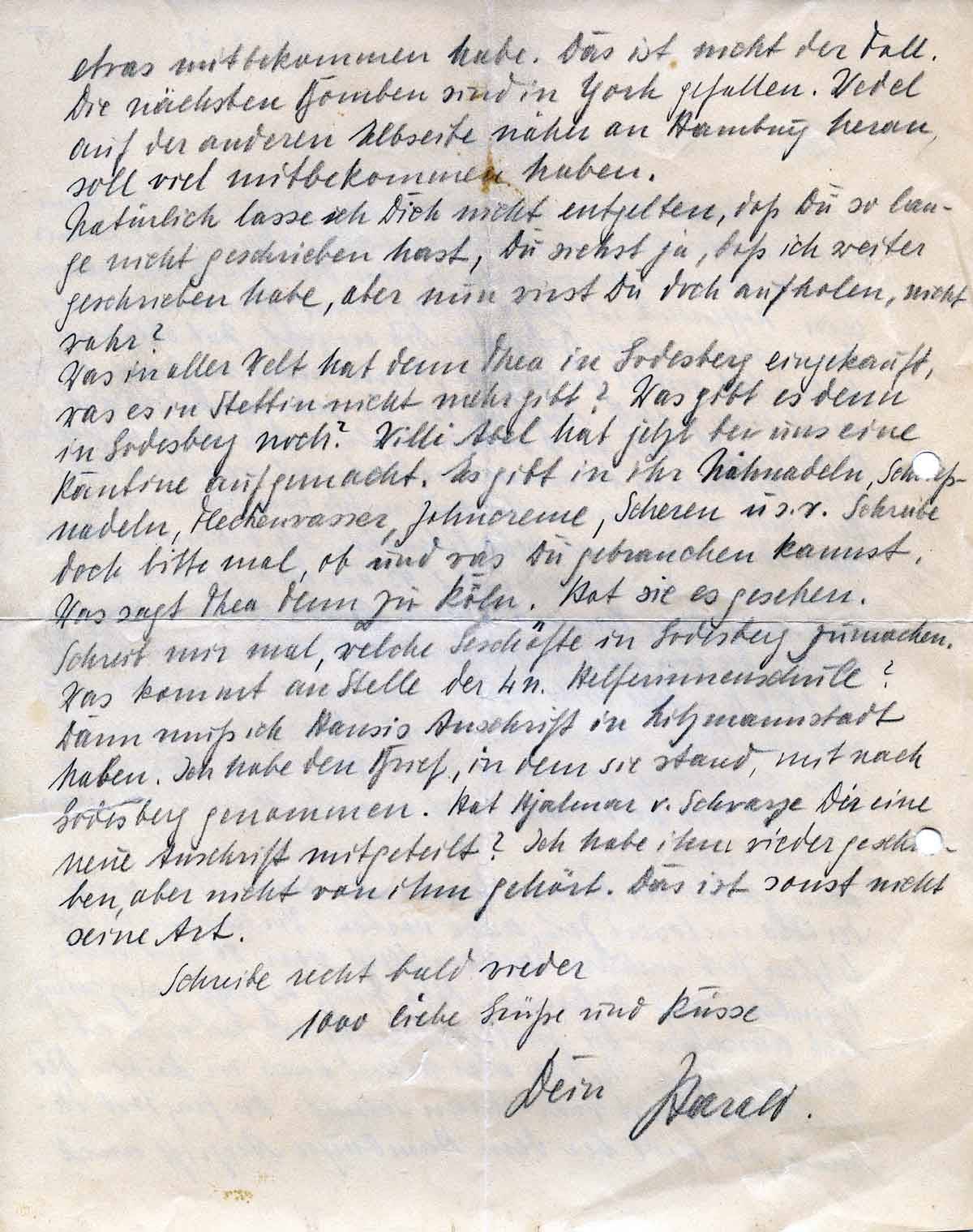 Was in aller Welt hat denn Thea in Godesberg eingekauft, was es in Stettin nicht mehr gibt? Was gibt es denn in Godesberg noch? Willi Abel hat jetzt bei uns eine Kantine aufgemacht. Es gibt in Ihr Nähnadeln, Schießnadeln (?), Fleckenwasser, Zahncreme, Scheren usw. Schreibe doch bitte mal, ob und was Du gebrauchen kannst. Was sagt er denn zu Köln. Hat sie es gesehen. Schreibt mir mal, welche Geschäfte in Godesberg zu machen. Was kommt an Stelle der 4n. Helferinnenschule? Dann muss ich Hansis Anschrift in Litzmannstadt haben. Ich habe den Brief, in dem sie stand, mit nach Godesberg genommen. Hat Hjalmar v. Schwartze Dir eine neue Anschrift mitgeteilt? Ich habe ihn wieder geschrieben, aber nicht mehr von ihm gehört. Das ist sonst nicht seine Art.