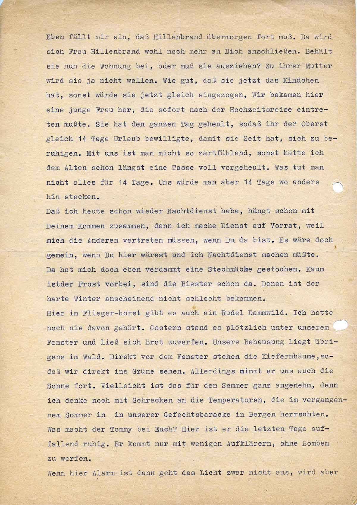 Hier im Fliegerhorst gibt es auch ein Rudel Dammwild. Ich hatte noch nie davon gehört. Gestern stand es plötzlich unter unserem Fenster und ließ sich Brot zu werfen. Unsere Behausung liegt übrigens im Wald. Direkt vor dem Fenster stehen die Kiefernbäume, sodaß wir direkt ins Grüne sehen. Allerdings nimmt er uns auch die Sonne fort. Vielleicht ist das für den Sommer ganz angenehm, denn ich denke noch mit Schrecken an die Temperaturen, die im vergangenen Sommer in unserer Gefechtsbaracke in Bergen herrschten. Was macht der Tommy bei euch? Hier ist er die letzten Tage auffallend ruhig. Er kommt nur mit wenigen aufklären, ohne Bomben zu werfen.