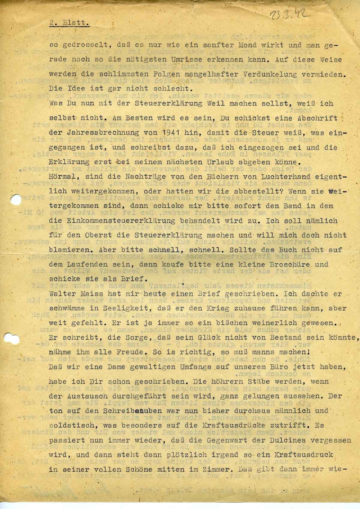 Was Du nun mit der Steuererklärung Weil machen sollst, weiß ich selbst nicht. Am Besten wird es sein, Du schickst eine Abschrift der Jahresabrechnung von 1941 hin, damit die Steuer weiß, was eingegangen ist, und schreibst dazu, daß ich einbezogen sei und die Erklärung erst bei meinem nächsten Urlaub abgeben könne.