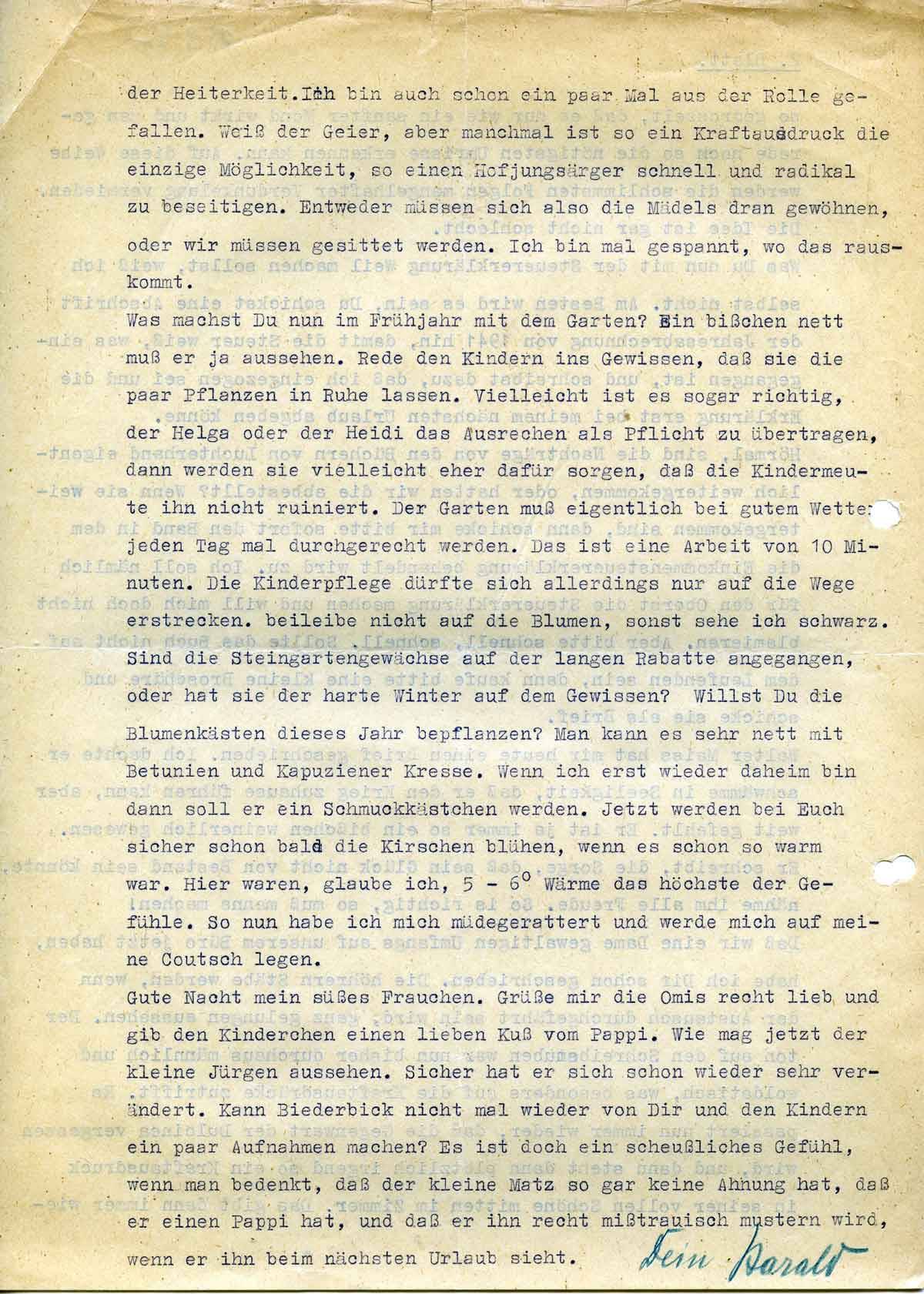 Was machst Du nun im Frühjahr mit dem Garten? Ein bisschen nett muß er ja aussehen. Rede den Kindern ins Gewissen, daß sie die paar Pflanzen in Ruhe lassen. Vielleicht ist es sogar richtig, der Helga oder der Heidi das Ausrechen als Pflicht zu übertragen, dann werden Sie vielleicht eher dafür sorgen, daß die Kindermeute ihn nicht ruiniert. Der Garten muß eigentlich bei gutem Wetter jeden Tag mal durchgerecht werden. Das ist eine Arbeit von 10 Minuten. Die Kinderpflege dürfte sich allerdings nur auf die Wege erstrecken, bei Leibe nicht auf die Blumen, sonst sehe ich schwarz. Sind die Steingartengewächse auf der langen Rabatte angegangen, oder hat sie der harte Winter auf dem Gewissen? Willst Du die Blumenkästen dieses Jahr bepflanzen? Man kann es sehr nett mit Petunien und Kapuziener Presse. Wenn ich erst wieder daheim bin dann soll er ein Schmuckkästchen werden. Jetzt werden bei Euch sicher schon bald die Kirschen blühen, wenn es schon so warm war. Hier waren, glaube ich, 5-6° Wärme das höchste der Gefühle. So nun habe ich mich müdegerattert und werde mich auf meine Coutch legen.