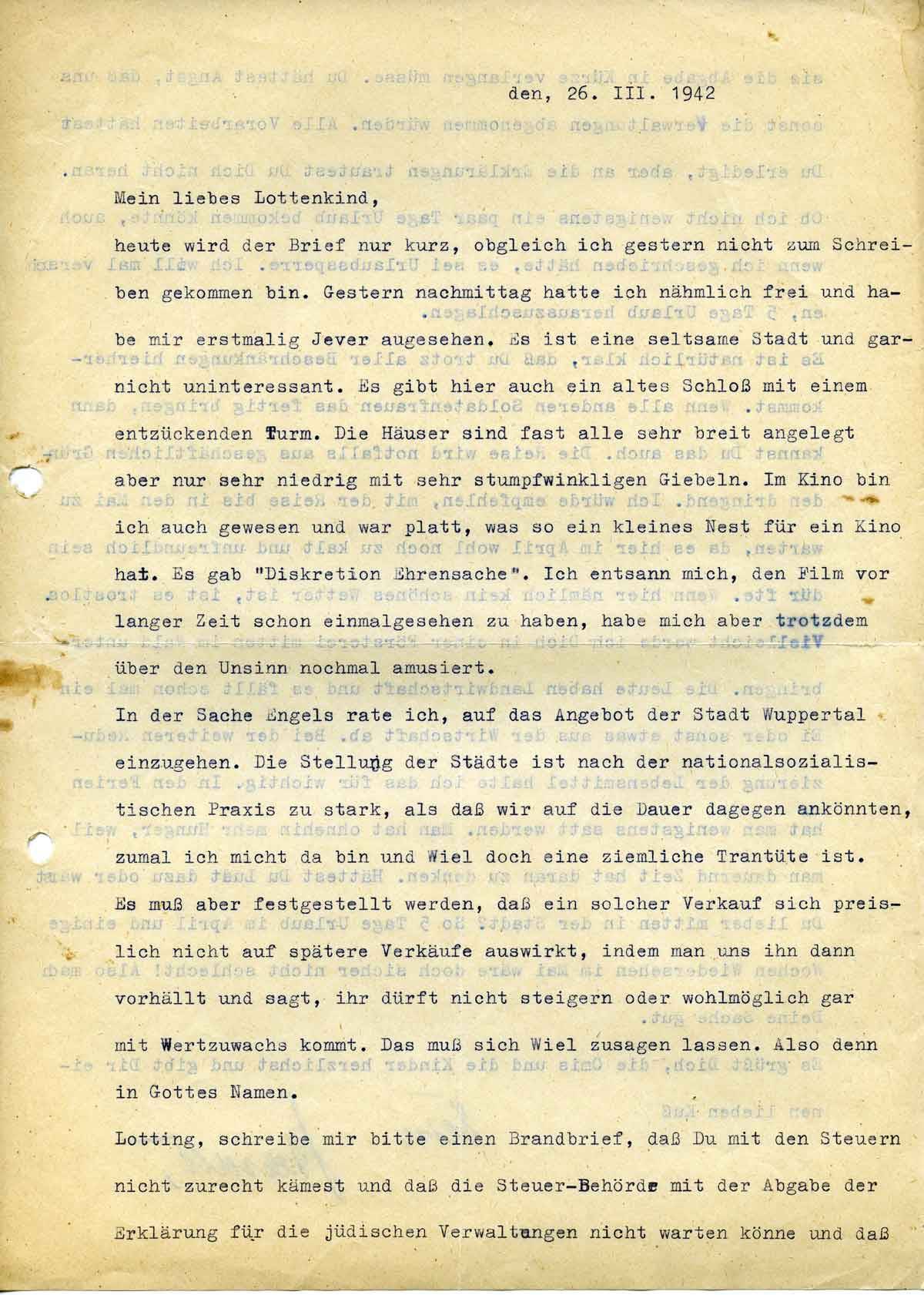 heute wird der Brief nur kurz, obgleich ich gestern nicht zum Schreiben gekommen bin. Gestern nachmittag hatte ich nähmlich frei und habe mir erstmalig Jever angesehen. Es ist eine seltsame Stadt und garnicht uninteressant. Es gibt hier auch ein altes Schloß mit einem entzückenden Turm. Die Häuser sind fast alle sehr breit angelegt aber nur sehr niedrig mit sehr stumpfwinkligen Giebeln. Im Kino bin ich auch gewesen und war platt, was so ein kleines Nest für ein Kino hat. Es gab „Diskretion Ehrensache“. Ich entsann mich, den Film vor langer Zeit schon einmal gesehen zu haben, habe mich aber trotzdem über den Unsinn noch mal amüsiert. In der Sache Engels rate ich, auf das Angebot der Stadt Wuppertal einzugehen. Die Stellung der Städte ist nach der nationalsozialistischen Praxis zu stark, als daß wir auf die Dauer dagegen an könnten, zumal ich nicht da bin und Wiel doch eine ziemliche Trantüte ist.