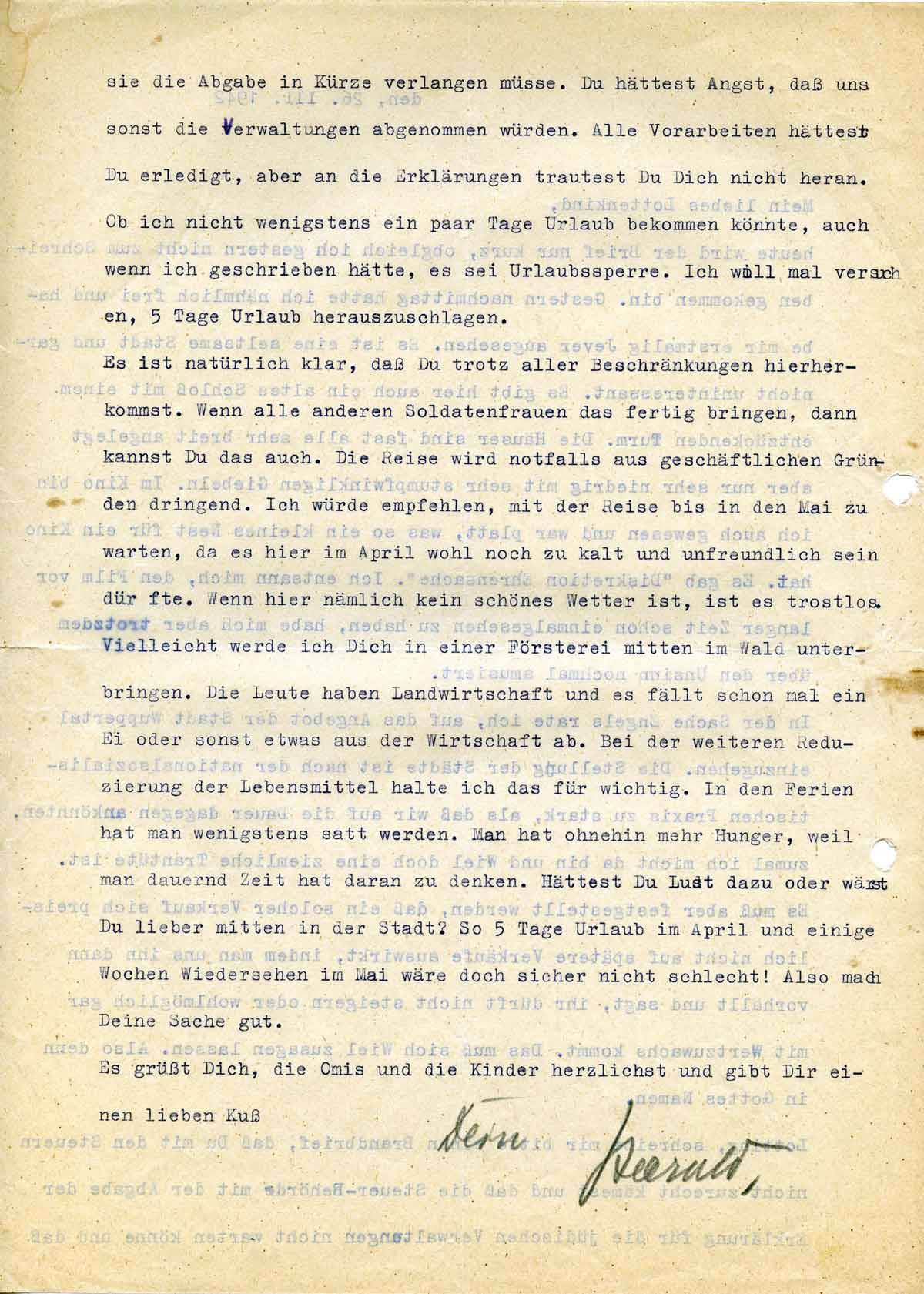 Es ist natürlich klar, daß Du trotz aller Beschränkungen hierherkommst. Wenn alle anderen Soldaten Frauen das fertig bringen, dann kannst Du das auch. Die Reise wird notfalls aus geschäftlichen Gründen dringend. Ich würde empfehlen, mit der Reise bis in den Mai zu warten, da es hier im April wohl noch zu kalt und unfreundlich sein dürfte. Wenn hier nämlich kein schönes Wetter ist, ist es trostlos. Vielleicht werde ich Dich in einer Försterei mitten im Wald unterbringen. Die Leute haben Landwirtschaft und es fällt schon mal ein Ei oder sonst etwas aus der Wirtschaft ab. Bei der weiteren Reduzierung der Lebensmittel halte ich das für wichtig. In den Ferien hat man wenigstens satt (zu) werden. Man hat ohnehin mehr Hunger, weil man dauernd Zeit hat daran zu denken hättest Du Lust dazu oder wärst du lieber mitten in der Stadt? So 5 Tage Urlaub im April und einige Wochen Wiedersehen im Mai wäre doch sicher nicht schlecht! Also mach Deine Sache gut.