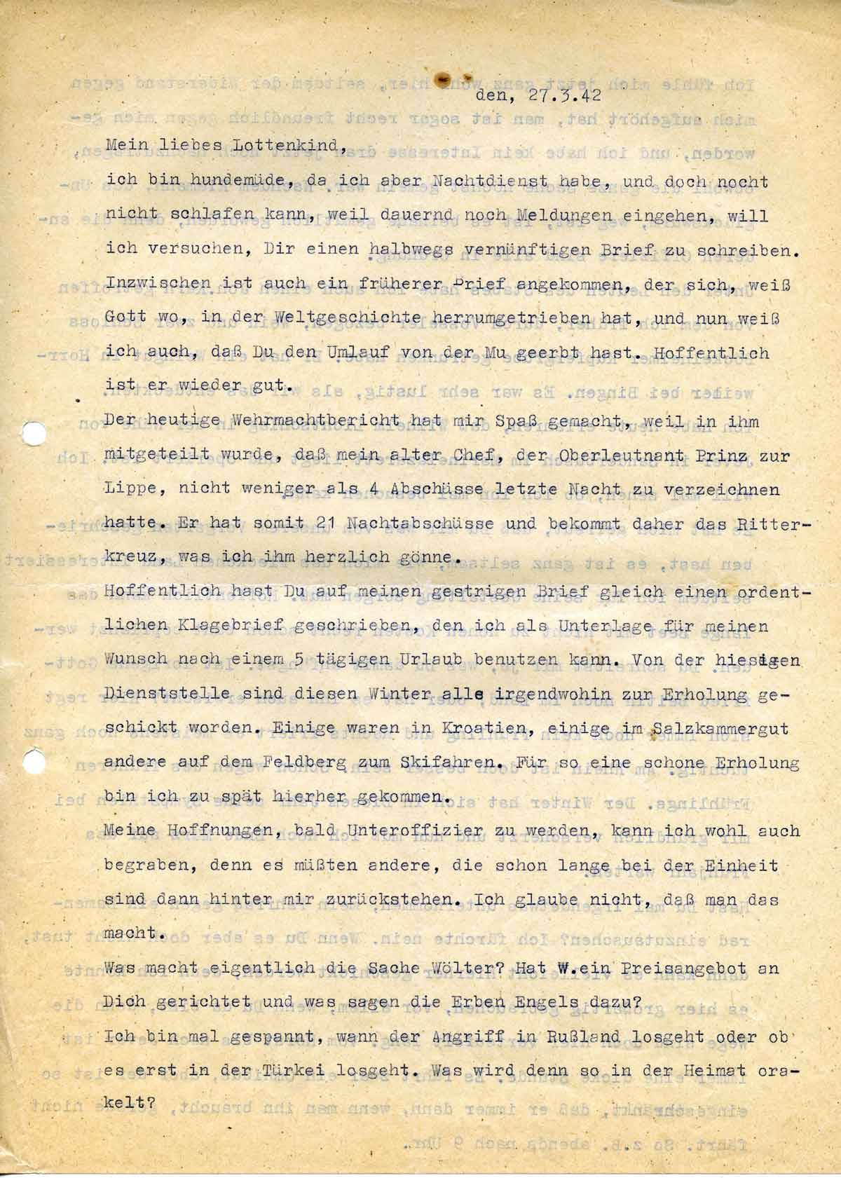 Der heutige Wehrmachtbericht hat mir Spaß gemacht, weil in ihm mitgeteilt wurde, daß mein alter Chef, der Oberleutnant Prinz zur Lippe, nicht weniger als 4 Abschüsse letzte Nacht zu verzeichnen hatte. Er hat somit 21 Nachtabschüsse und bekommt daher das Ritterkreuz, was ich ihm herzlich gönne.