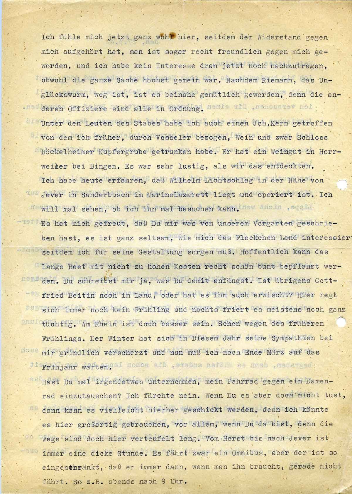 Unter den Leuten des Staates habe ich auch einen Joh. Kern getroffen von dem ich früher, durch Vosseler bezogen, weil und zwar Schloss Böckelheimer Kupfergrube getrunken habe. Er hat ein Weingut in Horrweiler bei Bingen. Es war sehr lustig, als wir das entdeckten. Ich habe heute erfahren, daß Wilhelm Lichtschlag in der Nähe von Jever in Sanderbusch im Marinelazarett liegt und operiert ist. Ich will mal sehen, ob ich ihn mal besuchen kann.