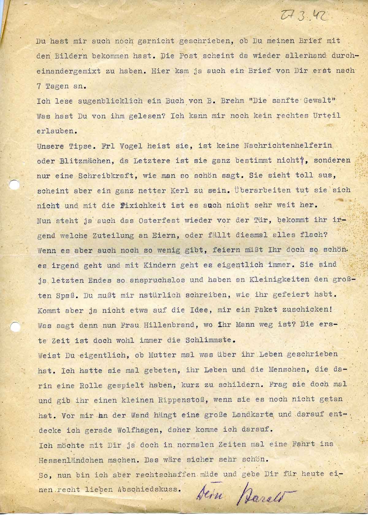 Nun steht ja auch das Osterfest wieder vor der Tür, bekommt ihr irgend welche Zuteilung an Eiern, oder fällt diesmal alles flach? Wenn es aber auch noch so wenig gibt, feiern müsst Ihr doch so schön es irgend geht und mit Kindern geht es eigentlich immer. Sie sind ja letzten Endes so anspruchslos und haben an Kleinigkeiten den größten Spaß. Du mußt mir natürlich schreiben, wie ihr gefeiert habt. Kommt aber ja nicht etwa auf die Idee, mir ein Paket zu schicken! Was sagt denn nun Frau Hillenbrand, wo ihr Mann weg ist? Die 1. Zeit ist doch wohl immer die Schlimmste.