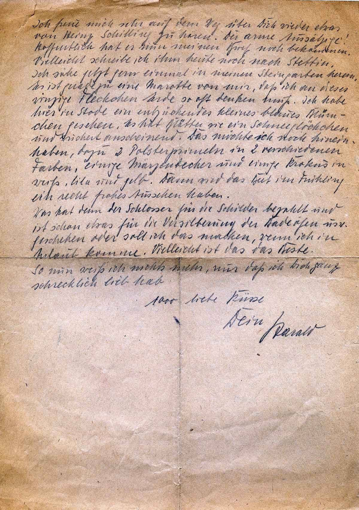 Ich sehe jetzt gern einmal in meinen Steingarten herein. Es ist geradezu eine Marotte von mir, daß ich an dieses winzige Fleckchen Erde so oft denken muß. Ich habe hier in Stade ein entzückendes kleines blaues Blümchen gesehen. Es hat Blätter wie ein Schneeglöckchen und wuchert (?) anscheinend. Das möchte ich noch hinein haben, dazu 2 Polsterprimeln in 2 verschiedenen Farben, einigen Märzenbecher und einige Krokusse in weiß, lila und gelb. Dann wird das Bild im Frühling ein recht frohes Aussehen haben. Was hat denn der Schlosser für die Schilder bezahlt und ist schon etwas für die Versilberung der Badeöfen usw. geschehen oder soll ich das machen, wenn ich in Urlaub komme. Vielleicht ist das das Beste. So nun weiß ich nichts mehr, nur daß ich Dich schrecklich lieb hab.