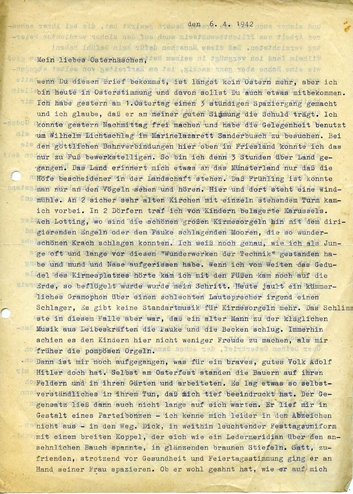 wenn Du diesen Brief bekommst, ist längst kein Ostern mehr, aber ich bin heute in Osterstimmung und davon sollst Du auch etwas mitbekommen. Ich habe gestern am 1. Ostertag ein 3stündigen Spaziergang gemacht und ich glaube, daß er an meiner guten Stimmung die Schuld trägt. Ich konnte gestern Nachmittag freimachen und habe die Gelegenheit benutzt, um Wilhelm Lichtschlag im Marinelazarett Sanderbusch zu besuchen. Bei den göttlichen Bahnverbindungen hier oben in Friesland konnte ich das nur zu Fuß bewerkstelligen. So bin ich denn 3 Stunden über Land gegangen. Das Land erinnert mich etwas an das Münsterland nur daß die Höfe bescheidener in der Landschaft stehen. Daß Frühling ist konnte man nur an den Vögeln sehen und hören. Hier und dort steht eine Windmühle. An 2 sicher sehr alten Kirchen mit einzeln stehendem Turm kam ich vorbei. In 2 Dörfern traf ich von Kindern belagerte Karussells.