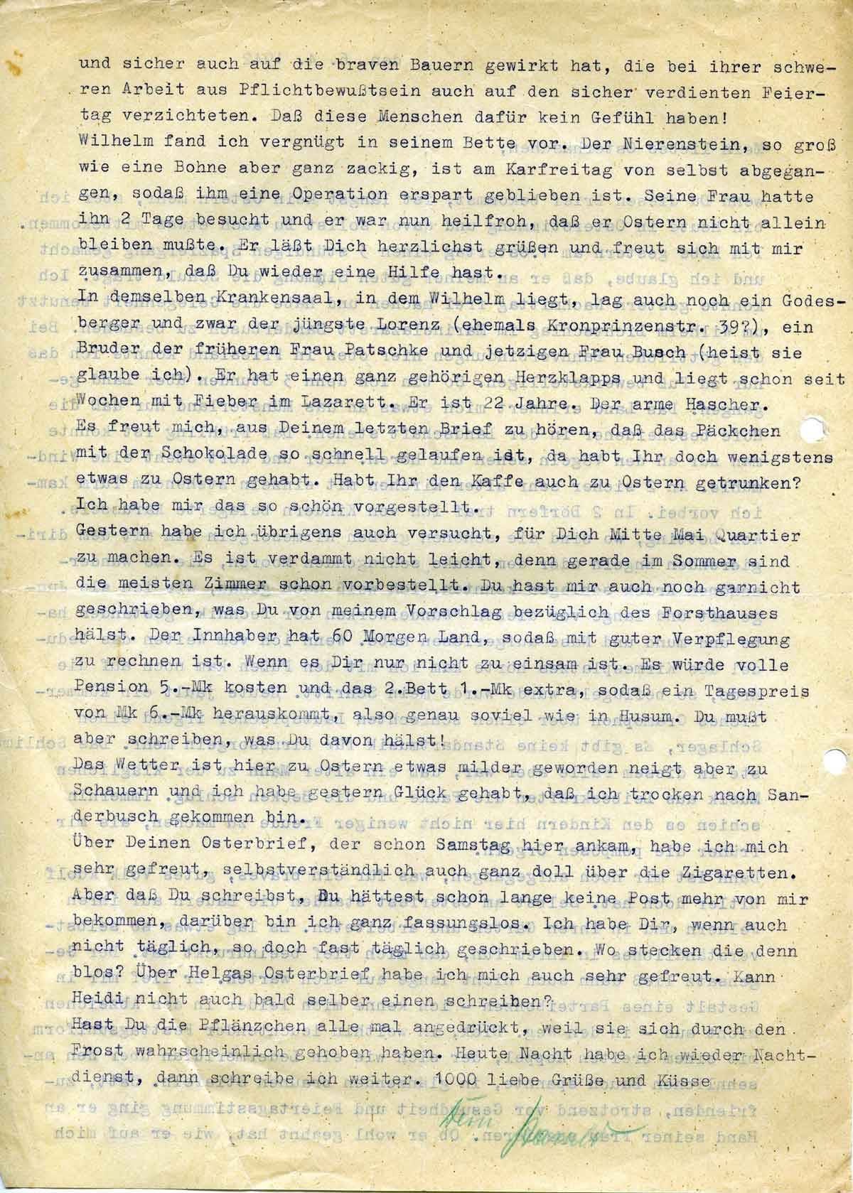 Gestern habe ich übrigens auch versucht, für Dich Mitte Mai Quartier zu machen. Es ist verdammt nicht leicht, denn gerade im Sommer sind die meisten Zimmer schon vorbestellt. Du hast mir auch noch garnicht geschrieben, was Du von meinem Vorschlag bezüglich des Forsthauses hältst. Der Inhaber hat 60 Morgen Land, sodaß mit guter Verpflegung zu rechnen ist. Wenn es Dir nur nicht so einsam ist. Es würde volle Pension 5,- Mk kosten und das 2.Bett 1,- Mk extra, sodaß ein Tagespreis von Mk 6, herauskommt, also genau so viel wie in Husum. Du mußt aber schreiben, was Du davon hälst.