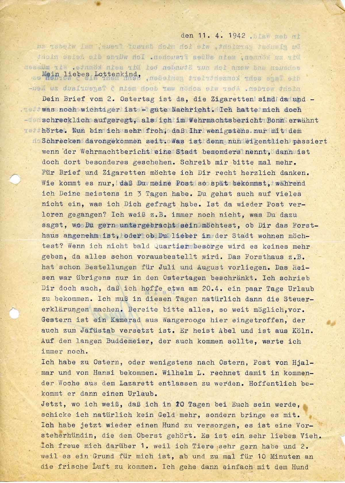 Dein Brief vom 2. Ostertag ist da, die Zigaretten sind da und – was noch wichtiger ist – gute Nachricht. Ich hatte mich doch schrecklich aufgeregt, als ich im Wehrmachtsbericht Bonn erwähnt hörte. Nun bin ich sehr froh, daß Ihr wenigstens nur mit dem Schrecken davon gekommen seid. Was ist denn nun eigentlich passiert wenn der Wehrmacht Bericht eine Stadt besonders nennt, dann ist doch dort besonderes geschehen. Schreib mir bitte mal mehr. Für Brief und Zigaretten möchte ich Dir recht herzlich danken. Wie kommt es nur, daß Du meine Post so spät bekommst, während ich Deine meistens in 3 Tagen habe. Du gehst auch auf vieles nicht ein, was ich Dich gefragt habe. Ist da wieder Post verloren gegangen? Ich weiß z.B. immer noch nicht, was Du dazu sagst, wo Du gern untergebracht sein möchtest, ob Dir das Forsthaus angenehm ist, oder ob Du lieber in der Stadt wohnen möchtest? Wenn ich nicht bald Quartier besorge wird es keines mehr geben, da alles schon voraus bestellt wird. Das Forsthaus hat z.B. schon Bestellungen für Juli und August vorliegen. Das Reisen war übrigens nur in den Ostertagen beschränkt. Ich schrieb Dir doch auch, daß ich hoffe etwa am 20. 4. ein paar Tage Urlaub zu bekommen. Ich muß in diesen Tagen natürlich dann die Steuererklärungen machen. Bereite bitte alles, soweit möglich, vor. Gestern ist ein Kamerad aus Wangerooge hier eingetroffen, der auch zum Jafüstab versetzt ist. Er heißt Abel und ist aus Köln. Auf den langen Buddemeier, der auch kommen sollte, warte ich immer noch.
