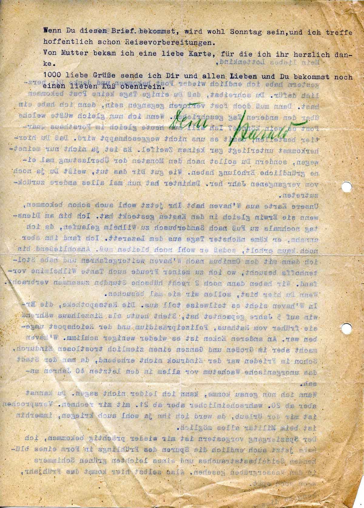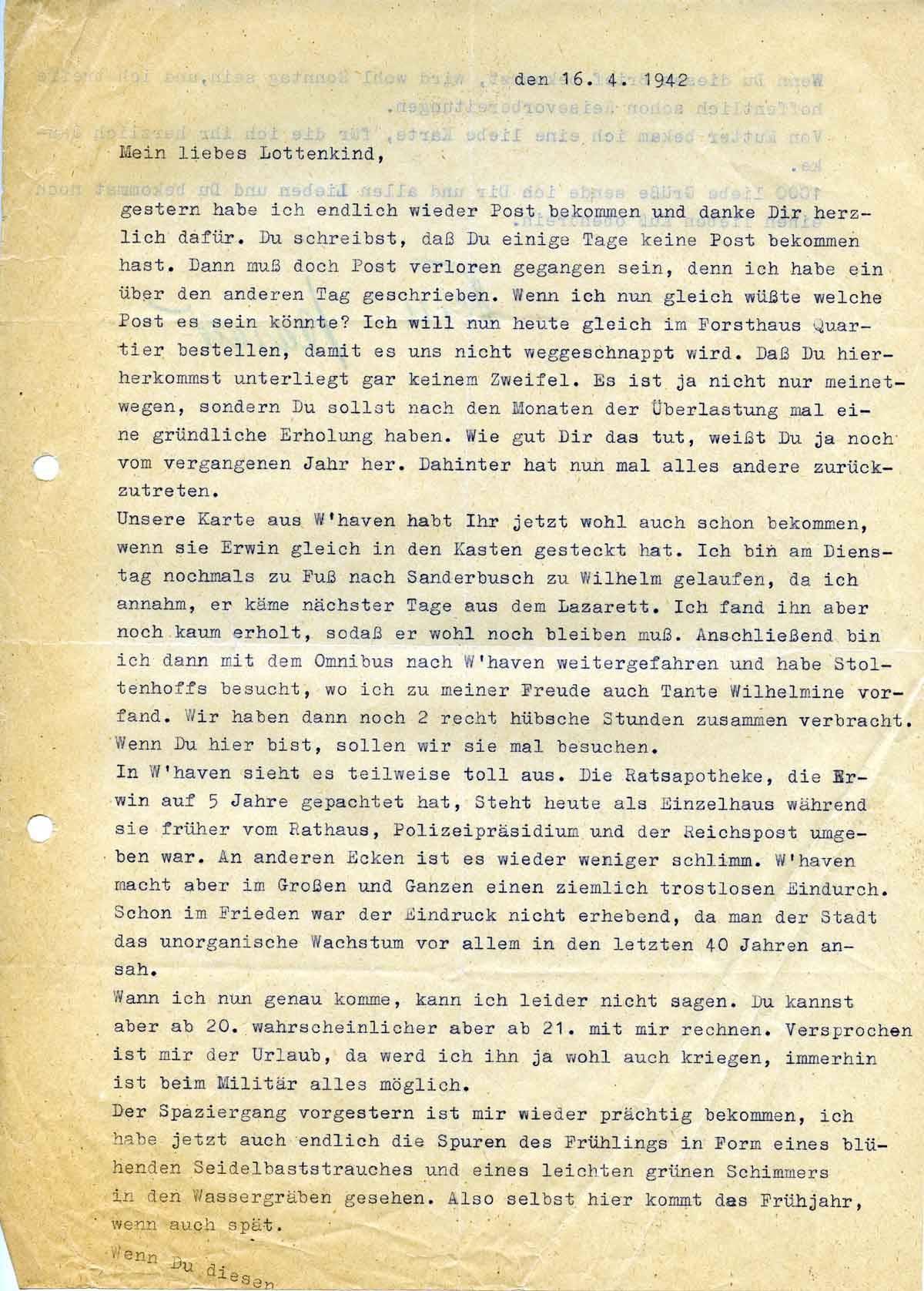 Unsere Karte aus W haven habt Ihr jetzt wohl auch schon bekommen, wenn sie Erwin gleich in den Kasten gesteckt hat. Ich bin am Dienstag nochmals zu Fuß nach Sander Busch zu Wilhelm gelaufen, da ich annahm, er käme nächster Tage aus dem Lazarett. Ich fand ihn aber noch kaum erholt, sodaß er wohl noch bleiben muß. Anschließend bin ich dann mit dem Omnibus nach W´haven weiter gefahren und habe Stoltenberg besucht, wo ich zu meiner Freude auch Tante Wilhelmine vorfand. Wir haben dann noch 2 recht hübsche Stunden zusammen verbracht. Wenn Du hier bist, sollen wir sie mal besuchen.