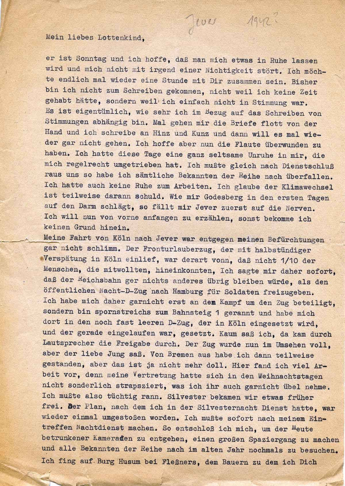 Meine Fahrt von Köln nach Jever war entgegen meinen Befürchtungen gar nicht so schlimm. Der Fronturlauberzug, der mit halbstündiger Verspätung in Köln einlief, war derart voll, daß nicht 1/10 der Menschen, die mitwollten, hinein konnten. Ich sagte mir daher sofort, daß der Reichsbahn gar nichts anderes übrig bleiben würde, als den öffentlichen Nacht-D-Zug für Soldaten freizugeben. Ich habe mich daher garnicht erst an dem Kampf um den Zug beteiligt, sondern bin spornstreichs zum Bahnsteig 1 gerannt und habe mich in den noch fast leeren