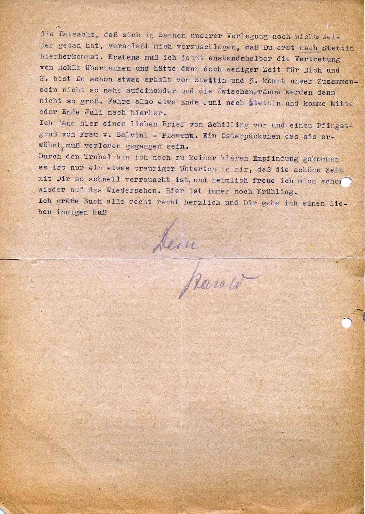 die Tatsache, daß sich in Sachen unsere Verlegung noch nichts weiter getan hat, veranlaßt mich vorzuschlagen, daß Du erst nach Stettin hierherkommst. 1. muß ich jetzt anstandshalber die Vertretung von Hall übernehmen und hätte dann doch weniger Zeit für Dich und 2. bist Du schon etwas erholt von Stettin und 3. kommt unser Zusammensein nicht so nahe aufeinander und die Zwischenräume werden dann nicht so groß. Fahre also etwa Ende Juni nach Stettin und komme Mitte oder Ende Juni nach hierher.