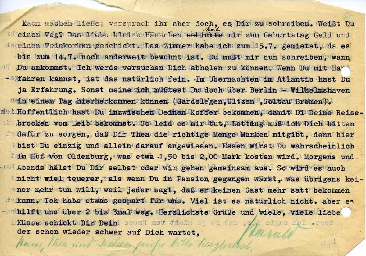 Hoffentlich hast Du inzwischen Deinen Koffer bekommen, damit Du Deine Reisegruppen vom Leib bekommst. So leid es mir tut, Lotti muß ich Dich bitten dafür zu sorgen, daß Thea die richtige Menge Marken mitgibt, denn hier bist Du einzig und allein darauf angewiesen. Essen wirst Du wahrscheinlich im Hof von Oldenburg, was etwa 1,50 bis 2,00 Mk kosten wird. Morgens und abends hältst Du Dir selbst oder wir gehen gemeinsam aus. So wird es auch nicht viel teuerer, als wenn Du in Pension gegangen wärst, was übrigens keiner mehr tun will, weil jeder sagt, daß er keinen Gast mehr satt bekommen kann. Ich habe etwas gespart für uns. Viel ist es natürlich nicht, aber es hilft uns über 2 bis 3mal weg. Herzlichste Grüße und viele, viele liebe Küsse schickt Dir