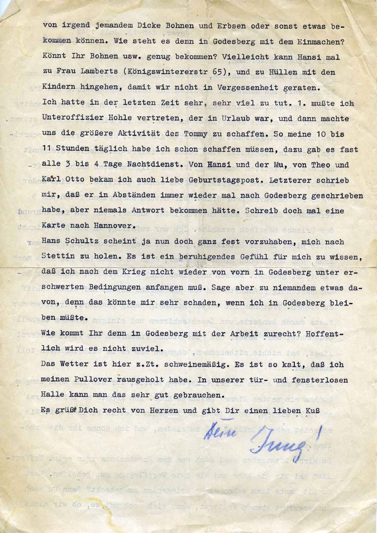 von irgend jemandem Dicke Bohnen und Erbsen oder sonst etwas bekommen können. Wie steht es denn in Godesberg mit dem Einmachen? Könnt Ihr Bohnen usw. genug bekommen? Vielleicht kann Hansi mal zu Frau Lamberts (Königswinterer Straße 65) und zu Hüllen mit den Kindern hingehen, damit wir nicht in Vergessenheit geraten.