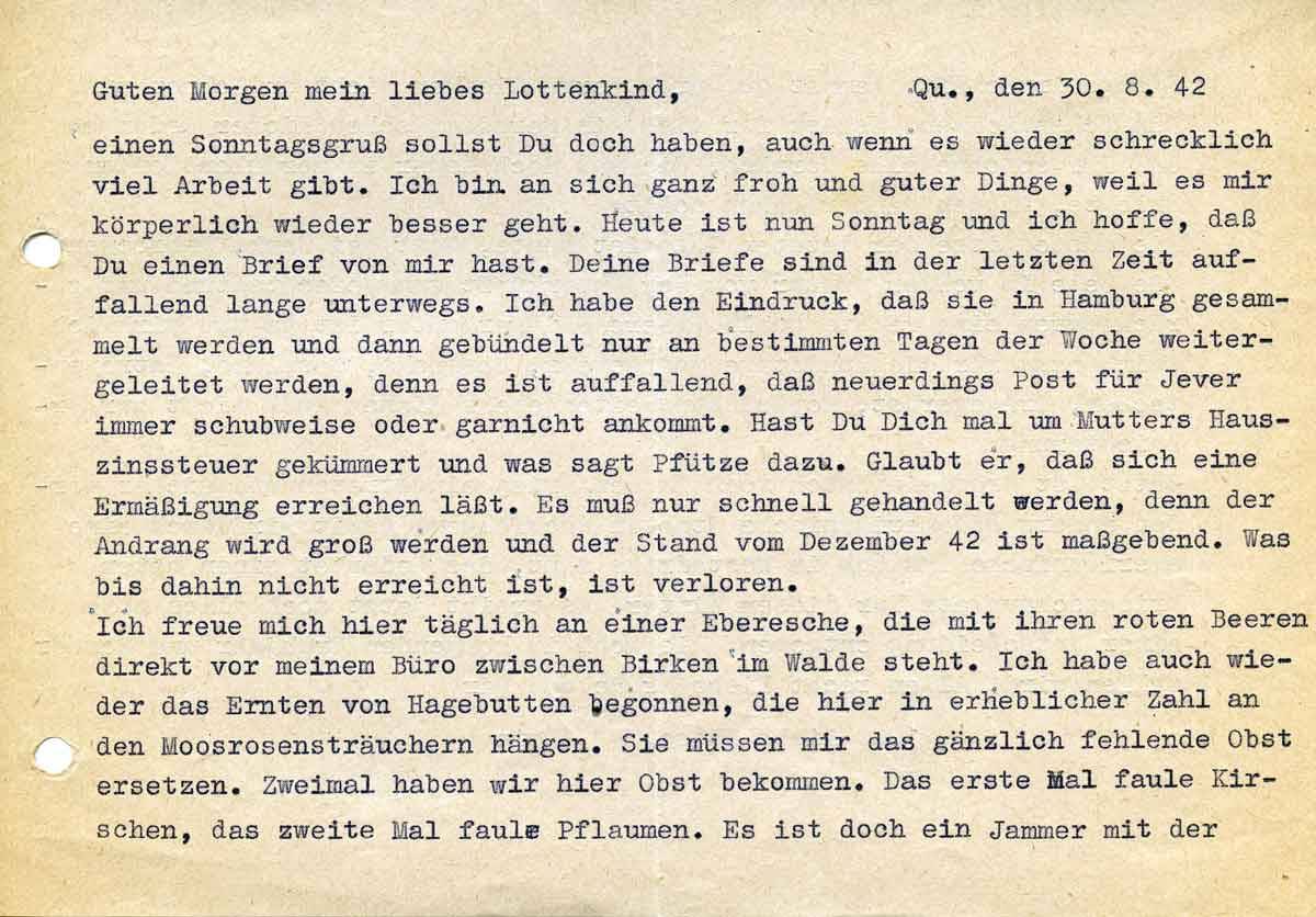 einen Sonntagsgruß sollst Du auch haben, auch wenn es wieder schrecklich viel Arbeit gibt. Ich bin an sich ganz froh und guter Dinge, weil es mir körperlich wieder besser geht. Heute ist nun Sonntag und ich hoffe, daß du einen Brief von mir hast. Deine Briefe sind in der letzten Zeit auffallend lange unterwegs. Ich habe den Eindruck, daß sie in Hamburg gesammelt werden und dann gebündelt nur an bestimmten Tagen in der Woche weitergeleitet werden, denn es ist auffallend, daß neuerdings Post für Jever immer schubweise oder garnicht ankommt. Hast Du Dich mal um Mutters Hauszinssteuer gekümmert und was sagt Pfütze dazu. Glaubt er, daß sich eine Ermäßigung erreichen läßt. Es muß nur schnell gehandelt werden, denn der anderen wird groß werden und der Stand vom Dezember 42 ist maßgebend. Was bis dahin nicht erreicht ist, ist verloren.