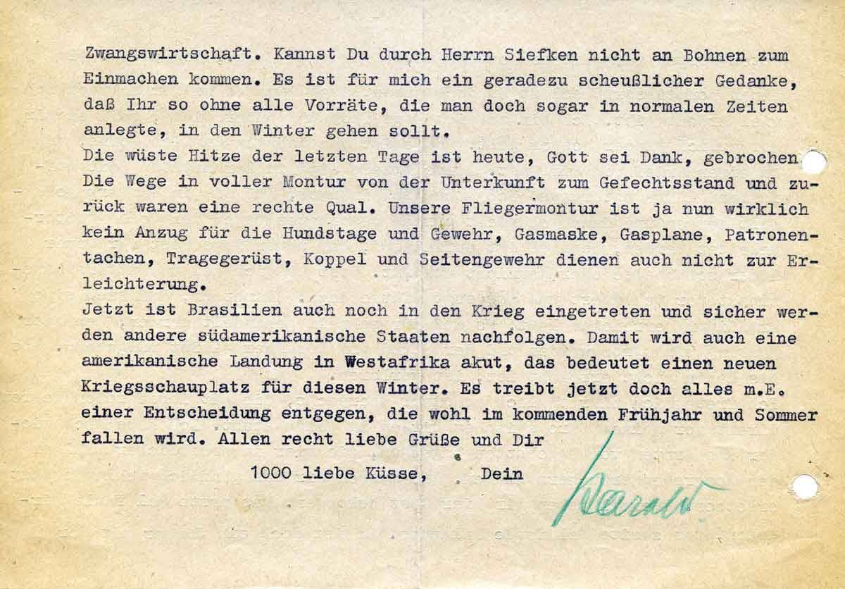 Jetzt ist Brasilien auch noch in den Krieg eingetreten und sicher werden andere südamerikanische Staaten nachfolgen. Damit wird auch eine amerikanische Landung in Westafrika akut, das bedeutet einen neuen Kriegsschauplatz für diesen Winter. Es treibt jetzt doch alles m.E. einer Entscheidung entgegen, die wohl im kommenden Frühjahr und Sommer fallen wird. Allen Recht liebe Grüße und Dir