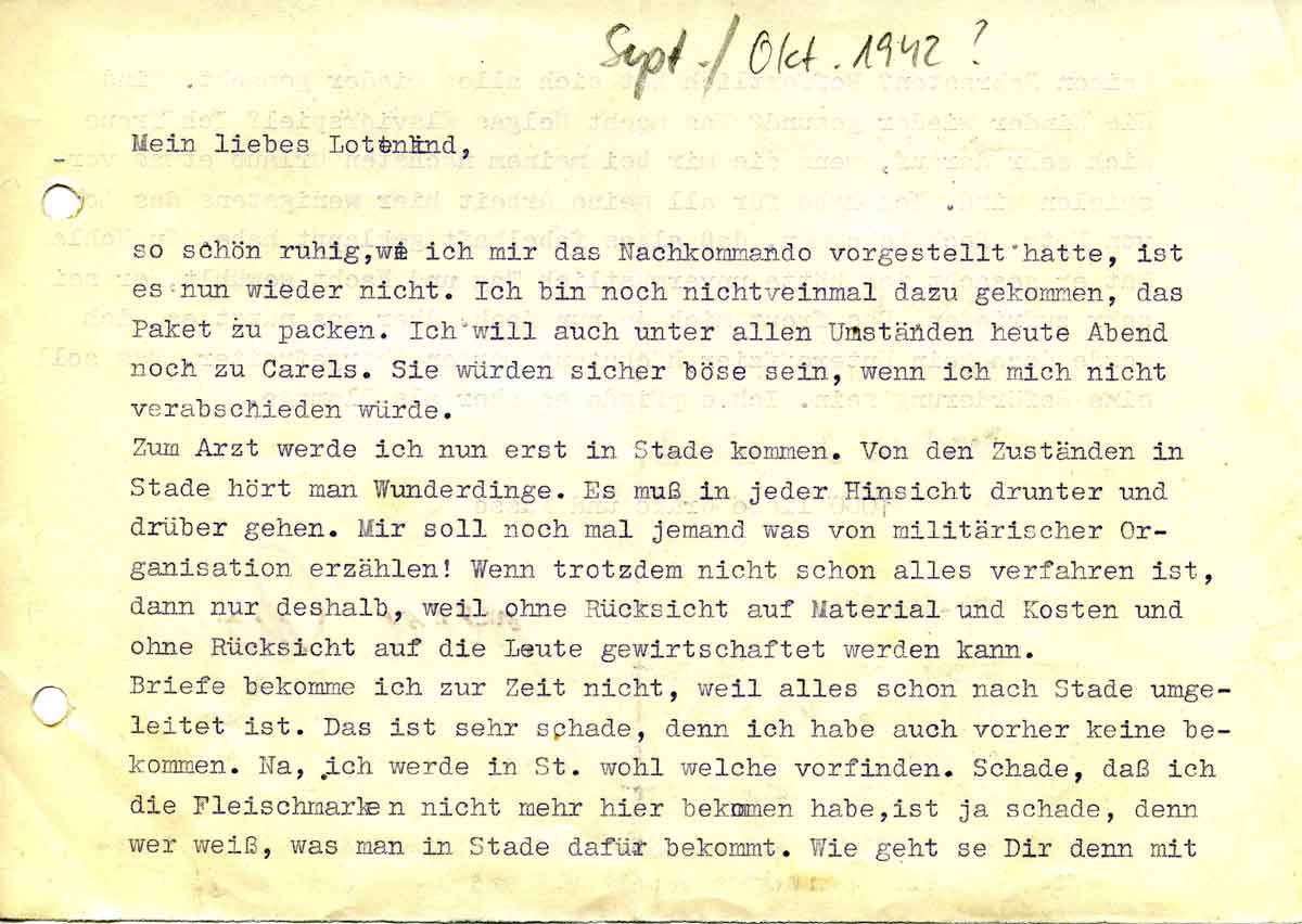 Zum Arzt werde ich nun erst in Stade kommen. Von den Zuständen in Stade hört man Wunderdinge. Es muß in jeder Hinsicht drunter und drüber gehen. Mir soll noch mal jemand was von militärischer Organisation erzählen! Wenn trotzdem nicht schon alles Verfahren ist, dann nur deshalb, weil ohne Rücksicht auf Material und Kosten ohne Rücksicht auf die Leute gewirtschaftet werden kann.