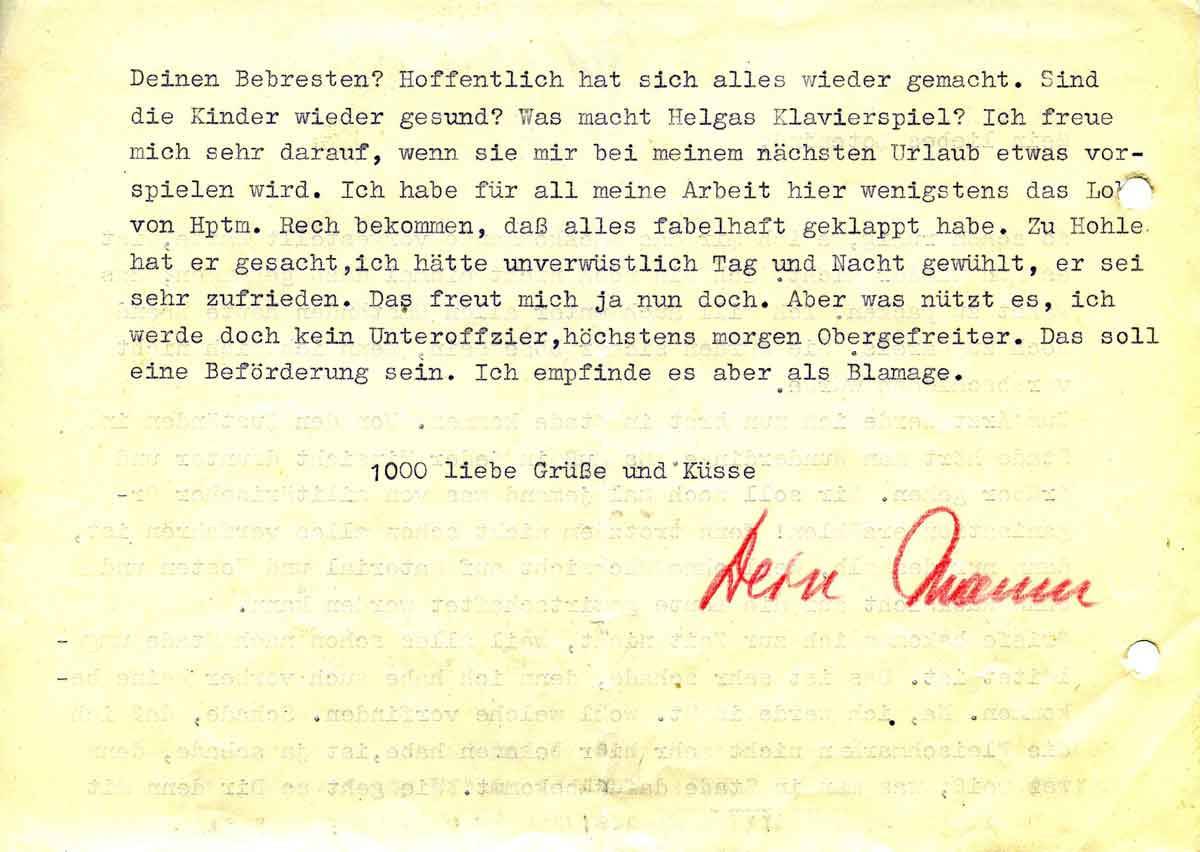 Deinen Bebresten (?). Hoffentlich hat sich wieder alles gemacht. Sind die Kinder wieder gesund? Was macht Helgas Klavierspiel? Ich freue mich sehr darauf, wenn sie mir bei meinem nächsten Urlaub etwas vorspielen wird. Ich habe für all meine Arbeit hier wenigstens das Lob von Hptm. Rech bekommen, daß alles fabelhaft geklappt habe. Zu Hohle hat er gesacht, ich hätte unverwüstlich Tag und Nacht gewühlt, er sei sehr zufrieden. Das freut mich ja nun doch. Aber was nützt es, ich werde doch kein Unteroffizier, höchstens morgen Obergefreiter. Das soll eine Beförderung sein. Ich empfinde es aber als Blamage.