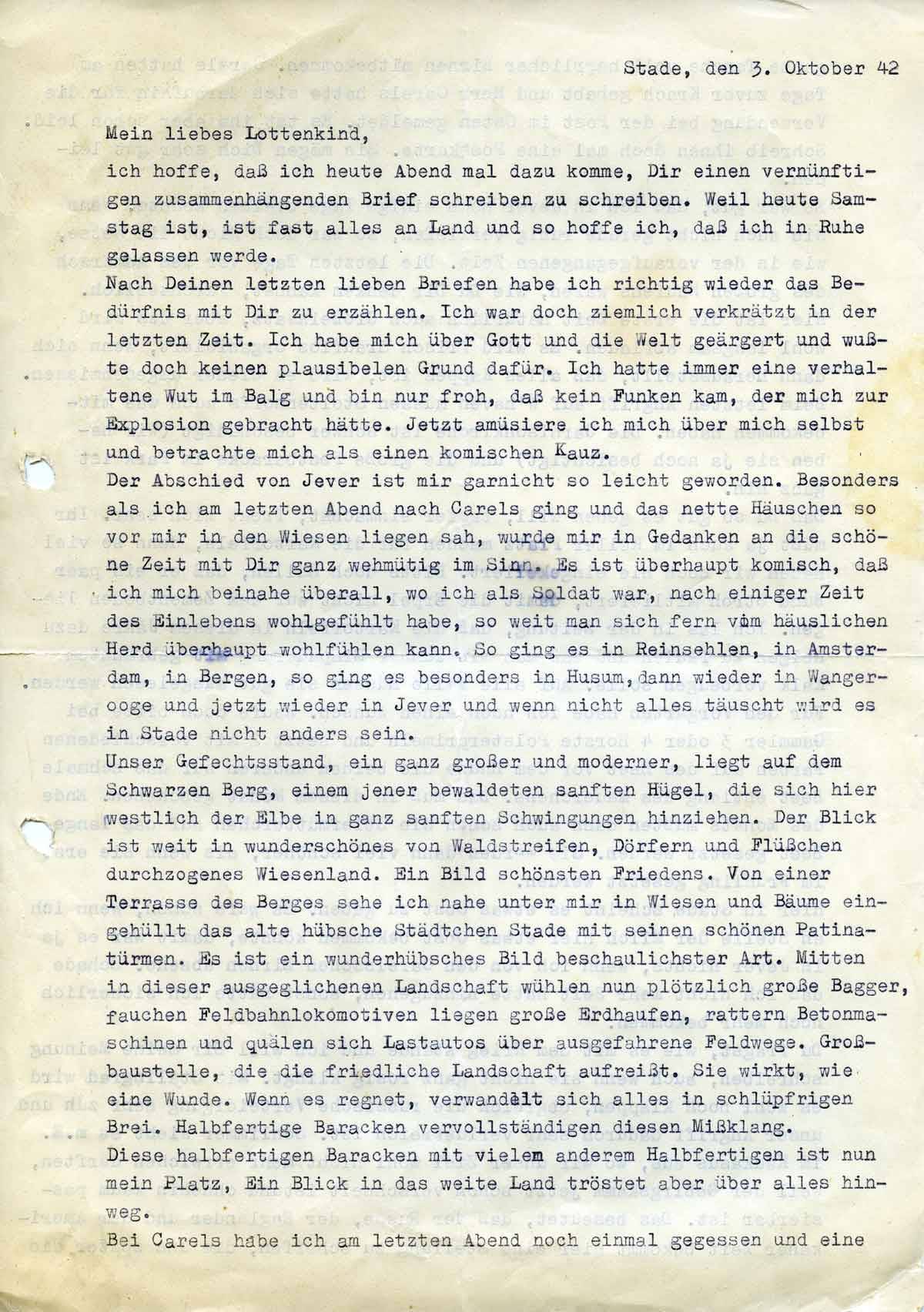 Der Abschied von Jever ist mir gar nicht so leicht geworden. Besonders als ich am letzten Abend nach Carels ging und das nette Häuschen so vor mir in den Wiesen liegen sah, wurde mir in Gedanken an die schöne Zeit mit Dir ganz wehmütig im Sinn. Es ist überhaupt komisch, dass ich mich beinahe überall, wo ich als Soldat war, nach einiger Zeit des Einlebens wohlgefühlt habe, soweit man sich fern vom häuslichen Herd überhaupt wohl fühlen kann. So ging es in Reinsehlen, in Amsterdam, in Bergen, so ging es besonders in Husum, dann wieder in Wangerooge und jetzt wieder in Jever und wenn nicht alles täuscht wird es in Stade nicht anders sein.