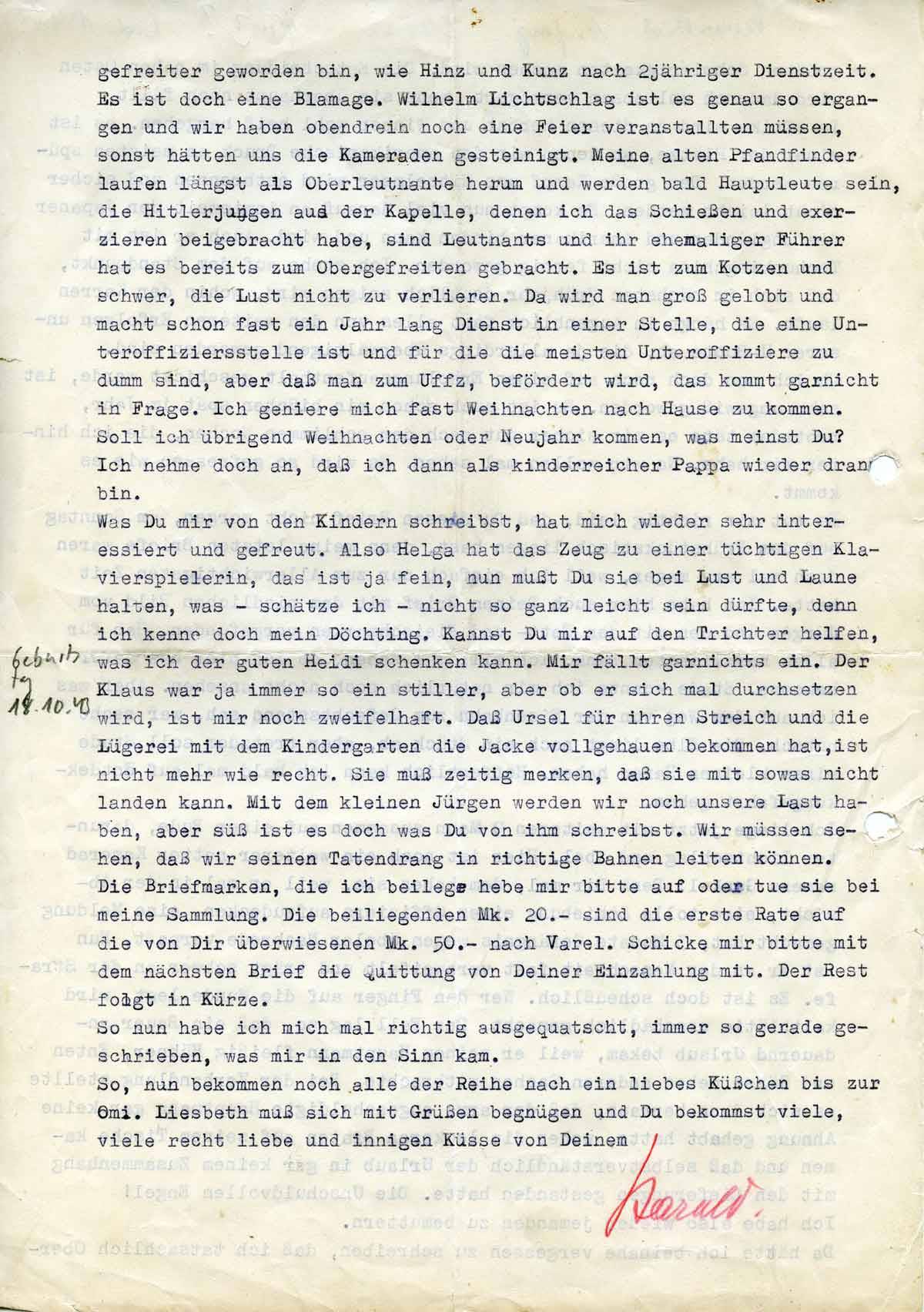 gefretier geworden bin, wie Hinz und Kunz nach 2-jähriger Dienstzeit. Es ist doch eine Blamage. Wilhelm Lichtschlag ist es genau so ergangen und wir haben obendrein noch eine Feier veranstallten müssen, sonst hätten uns die Kameraden gesteinigt. Meine alten Pfadfinder laufen längst als Oberleutnante herum und werden bald Hauptleute sein, die Hitlerjungen aus der Kapelle, denen ich das Schießen und exerzieren beigebracht habe, sind Leutnants und ihr ehemaliger Führer hat es bereits zum Obergefreiten gebracht. Es ist zum Kotzen und schwer, die Lust nicht zu verlieren. Da wird man Gelobt und macht schon fast ein Jahr lang Dienst in einer Stelle, die eine Unteroffiziersstelle ist und für die die meisten Unteroffiziere zu dumm sind, aber daß man zum Uffz. befördert wird, das kommt garnicht in Frage. Ich tendiere mich fast Weihnachten nach Hause zu kommen. Soll ich übrigens Weihnachten oder Neujahr kommen, was meinst Du? Ich nehme doch an, daß ich dann als kinderreicher Pappa wieder dran bin.