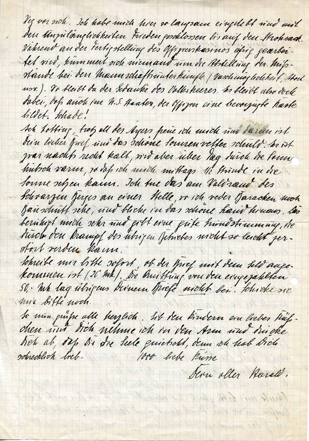 Schreibe mir bitte sofort, ob der Brief mit dem Geld angekommen ist (20 Mk). Die Quittung von von den eingezahlten 50,- Mk lag übrigens Deinem Brief nicht bei. Schicke sie mir bitte nach.