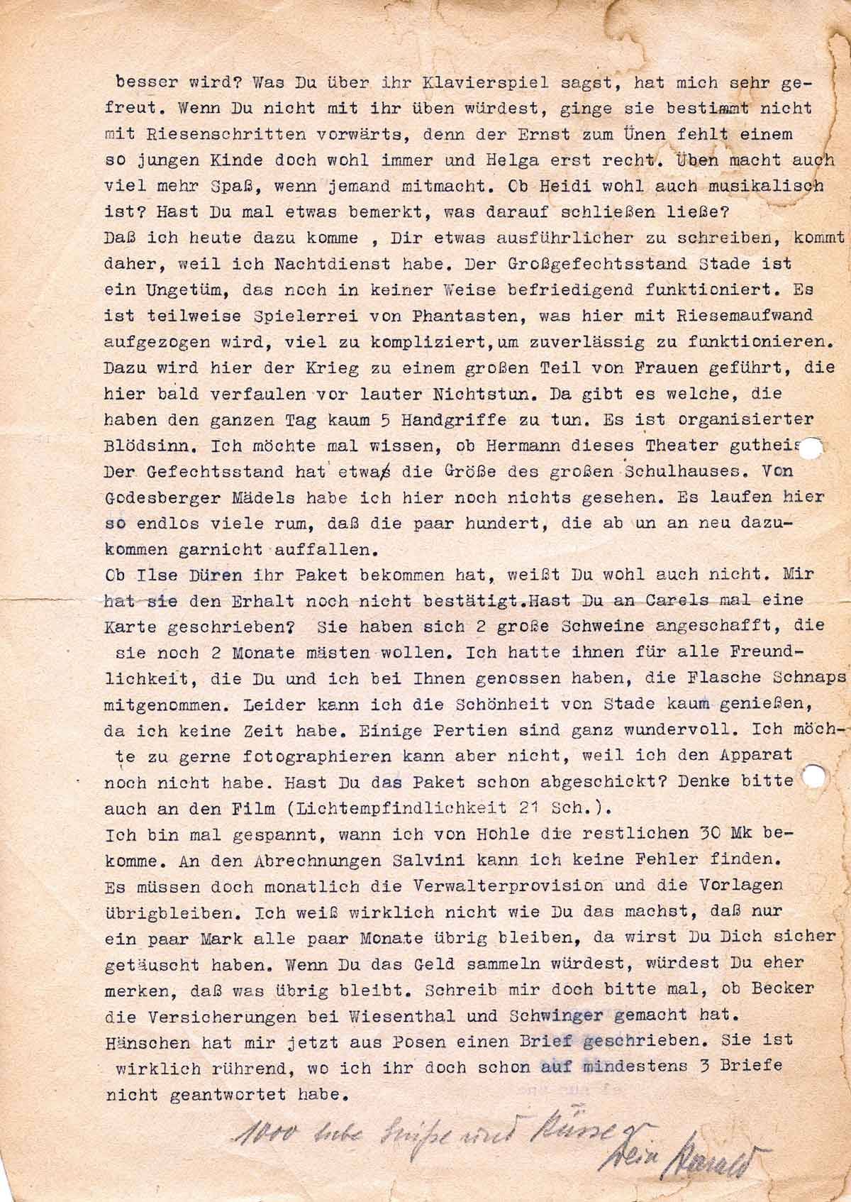 Daß ich heute dazu komme, Dir etwas ausführlicher zu schreiben, kommt daher, weil ich Nachtdienst habe. Der Gefechtsstand Stade ist ein Ungetüm, das noch in keiner Weise befriedigend funktioniert. Es ist teilweise Spielerrei von Phantasten, was hier mit Riesenaufwand aufgezogen wird, viel zu kompliziert, um zuverlässig zu funktionieren. Dazu wird hier der Krieg zu einem großen Teil von Frauen geführt, die hier bald verfault vor lauter Nichtstun. Da gibt es welche, die haben den ganzen Tag kaum 5 Handgriffe zu tun. Es ist organisierter Blödsinn. Ich möchte mal wissen, ob Hermann (sc.Göhring) dieses Theater gutheißt. Der Gefechtsstand hat etwa die Größe des großen Schulhauses. Von Godesberger Mädels habe ich hier noch nichts gesehen. Es laufen hier so endlos viele rum, daß die paar 100, die ab und an neu dazu kommen gar nicht auffallen.