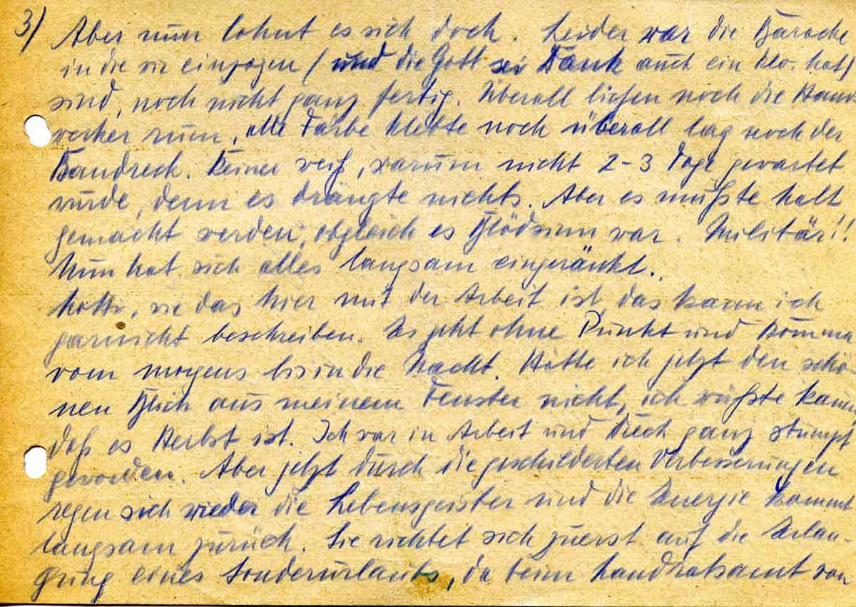 Lotti, wie das hier mit der Arbeit ist, das kann ich gar nicht beschreiben. Es geht ohne Punkt und Komma von morgens bis in die Nacht. Hätte ich jetzt den schönen Blick aus meinem Fenster nicht, ich wüsste kaum, daß es Herbst ist. Ich war in Arbeit und Dreck ganz stumpf geworden. Aber jetzt durch die geschilderten Verbesserungen regen sich wieder Lebensgeister und die Energie kommt langsam zurück. Sie richtet sich zuerst auf die Erlangung eines Sonderurlaubs, da beim Landratsamt von