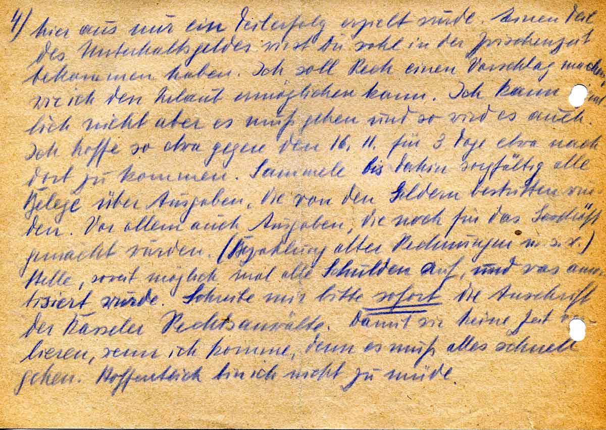 hier aus nur ein Teilerfolg erzielt wurde. Einen Teil des Unterhaltsgeldes wirst Du wohl in der Zwischenzeit bekommen haben. Ich soll Rech einen Vorschlag machen, wie ich den Urlaub ermöglichen kann. Ich kann eigentlich nicht aber es muß gehen und so wird es auch. Ich hoffe so etwa gegen den 16. November für 3 Tage etwa nach dort zu kommen. Sammele bis dahin sorgfältig alle Belege über Ausgaben, die von den Geldern bestritten wurden. Vor allem auch Ausgaben, die noch für das Geschäft gemacht wurden. (Bezahlung alter Rechnungen usw.). Stelle, soweit möglich mal alle Schulden auf und was amortisiert (?) Wurde. Schreibe mir bitte sofort die Anschrift der Rechtsanwälte, damit sie keine Zeit verlieren, wenn ich komme, denn es muß alles schnell gehen. Hoffentlich bin ich nicht zu müde.