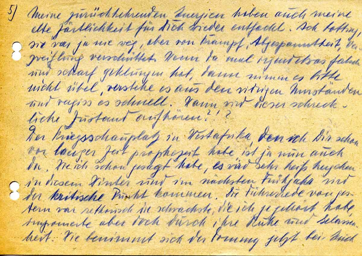 Der Kriegsschauplatz in Westafrika, den ich Dir schon vor langer Zeit prophezeit habe, ist ja nun auch da. Wie ich schon gesagt habe, es wird sehr heiß hergehen in diesem Winter und im nächsten Frühjahr wird der kritische Punkt kommen. Die Führerrede von gestern war rethorisch die schwächste, imponierte aber doch durch ihre Ruhe und Gelassenheit. Wie benimmt sich der Tommy jetzt bei euch.