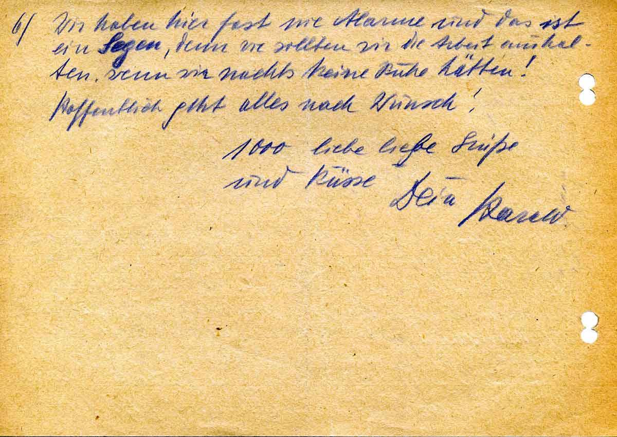 gemütlich wie nur irgend möglich machen. Der Vorteil ist groß. 1. wir sind nur zu 2 Leuten und können uns alles so einteilen, wie es uns passt. 2. Es herrscht eine göttliche Ruhe. 3. Wir haben eine wunderschöne Aussicht u.s. weiter. Wir sind in der Zwischenzeit auch mit den Geschäftsräumen umgezogen und zwar in eine neu errichtete Baracke am Waldrand, in der auch unsere Schlafbude liegt. Auch von meinem Arbeitsplatz aus habe ich jetzt einen herrlichen Blick weit ins Land hinein, statt wie bisher auf einen Holzschuppen mit Briketts. Auch ist alles viel heller und freundlicher. Du glaubst garnicht, was das ausmacht. Der Umzug war aber auch entsprechend scheußlich. Da ich allein bin mußte ich alles einpacken, dann einen ganzen Tag Schränke, Kisten, Panzerschränke usw. schleppen, dann wieder auspacken und dabei dürfte die laufende Arbeit keinen Augenblick unterbrochen werden. Es war lieblich! Es sind beinahe 2 ganze Nächte drauf gegangen.