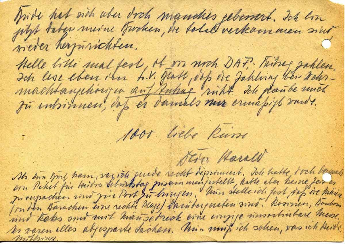 Stelle bitte mal fest, ob wir noch DAF.-Beitrag zahlen. Ich lese eben im L (?).V. Blatt, daß die Zahlung bei Wehrmacht Angehörigen auf Antragruht. Ich glaube mich zu entsinnen, daß er damals nur ermäßigt wurde.