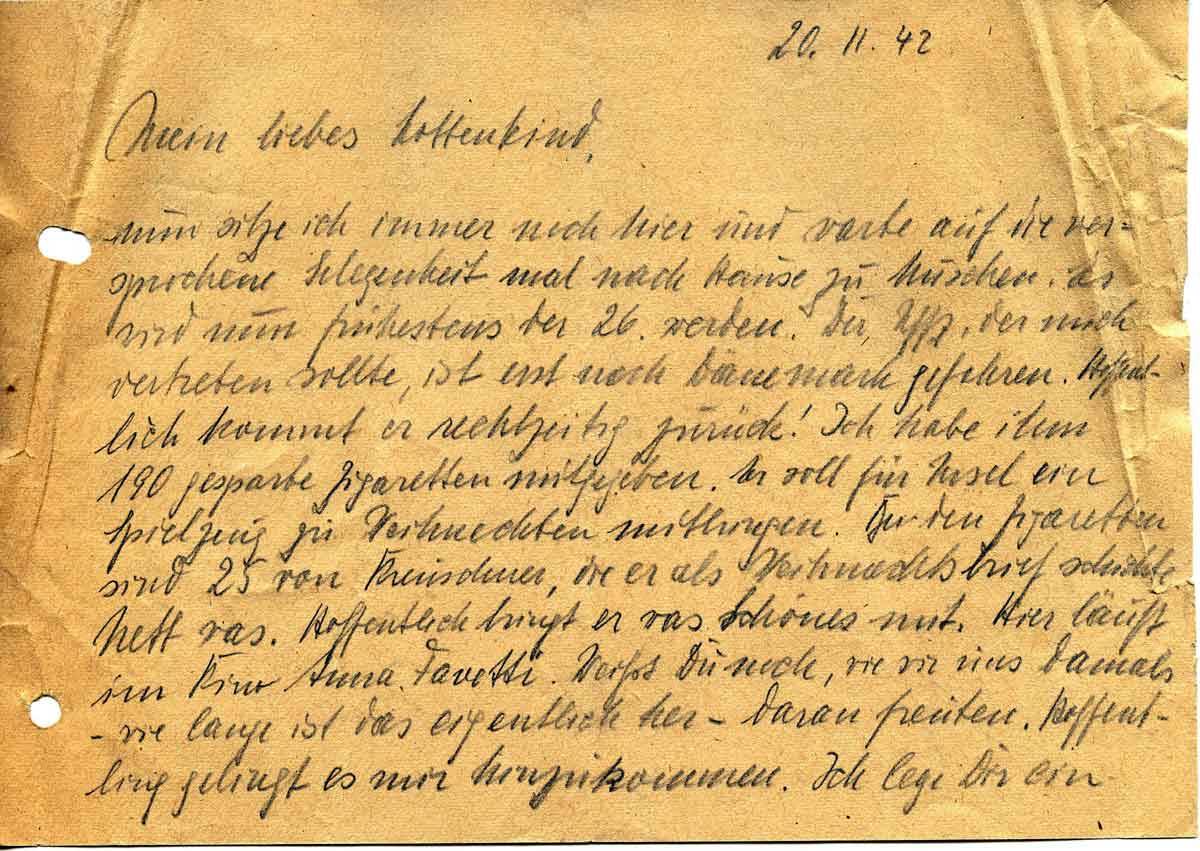 nun sitze ich immer noch hier und warte auf die versprochene Gelegenheit mal nach Hause zu huschen. Es wird nun frühestens der 26. werden. Der Uffz., Der mich vertreten sollte, ist erst nach Dänemark gefahren. Hoffentlich kommt er rechtzeitig zurück! Ich habe ihm 190 gesparte Zigaretten mitgegeben. Er soll für Ursel ein Spielzeug zu Weihnachten mitbringen. Bei den Zigaretten sind 25 von Kreuschner, die er als Weihnachtsbrief schickte. Nett was. Hoffentlich bringt er was Schönes mit. Hier läuft im Kino Anna Favetti.