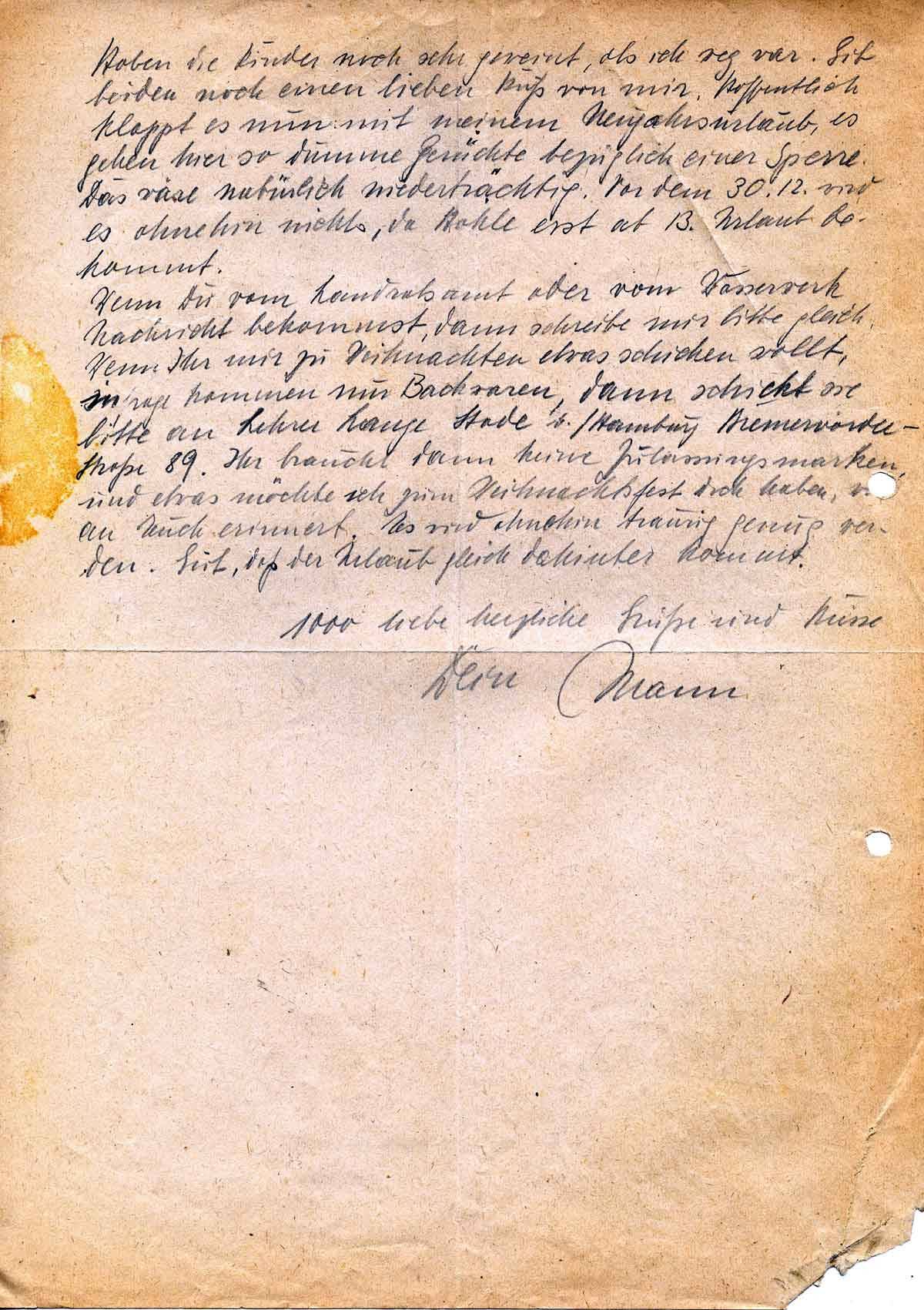 Wenn Du vom Landratsamt oder vom Wasserwerk Nachricht bekommst, dann schreibe mir bitte gleich. Wenn Ihr mir zu Weihnachten etwas schicken wollt, infrage kommen nur Backwaren, dann schickt sie bitte an Lehrer Lange b. Hamburg Bremervörder Straße 89. ihr braucht dann keine Zulassungsmarken und etwas möchte ich zum Weihnachtsfest doch haben, was an Euch erinnert. Es wird ohnehin traurig genug werden. Gut, daß der Urlaub gleich dahinter kommt.