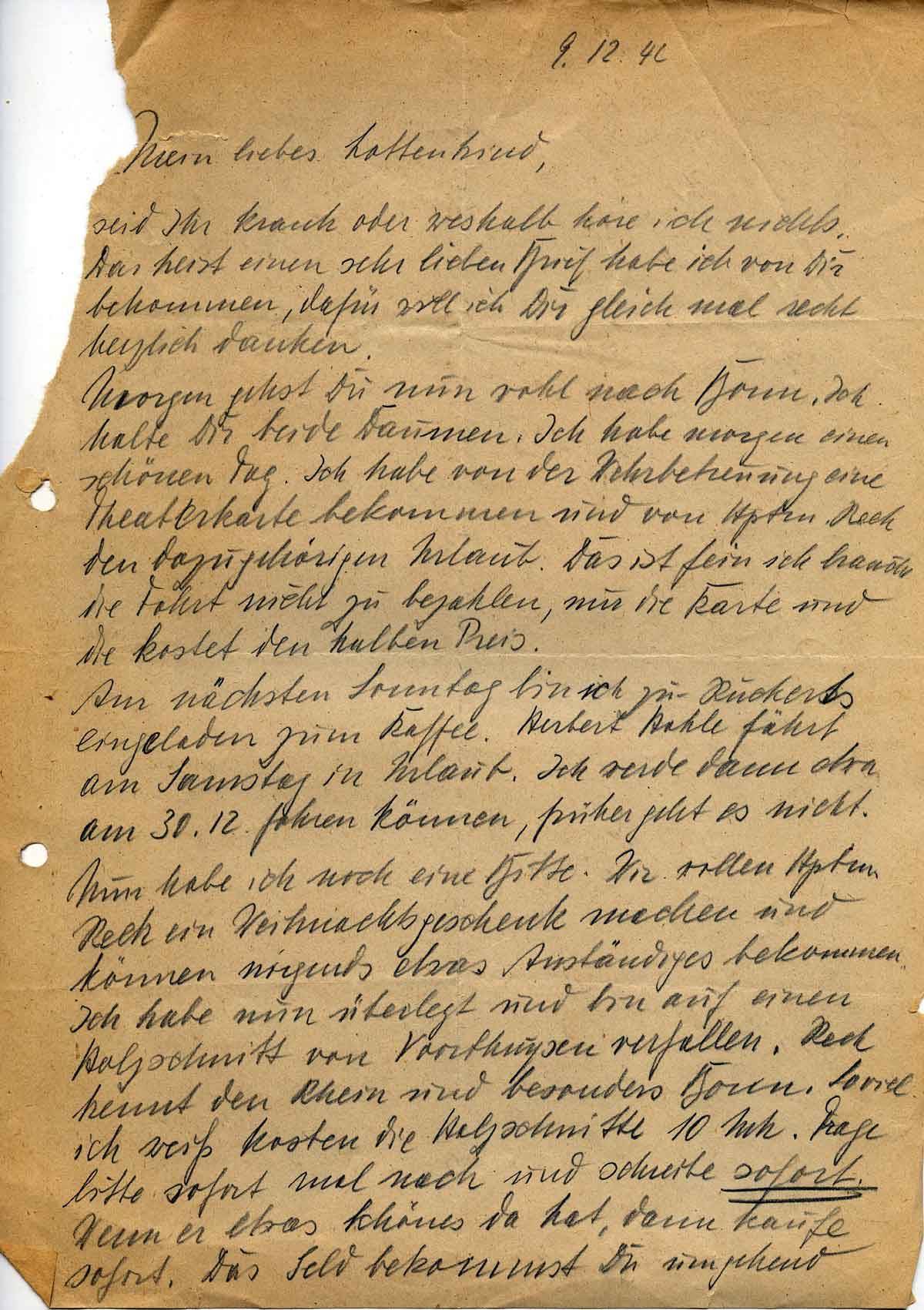Am nächsten Sonntag bin ich zu Rückerts eingeladen zum Kaffee. Herbert Kahle fährt am Samstag in Urlaub. Ich werde dann etwa am 30. Dezember fahren können, früher geht es nicht. Nun habe ich noch eine Bitte. Wir wollen Hptm. Rech ein Weihnachtsgeschenk machen und können nirgends etwas Anständiges bekommen. Ich habe nun überlegt und bin auf einen Holzschnitt von Voerthuusen verfallen. Rech kennt den Rhein und besonders Bonn so viel ich weiß kosten die Holzschnitte 10 Mk. Frage bitte sofort mal nach und schreibe sofort. Wenn er etwas Schönes da hat dann kaufe sofort. Das Geld bekommst Du umgehend
