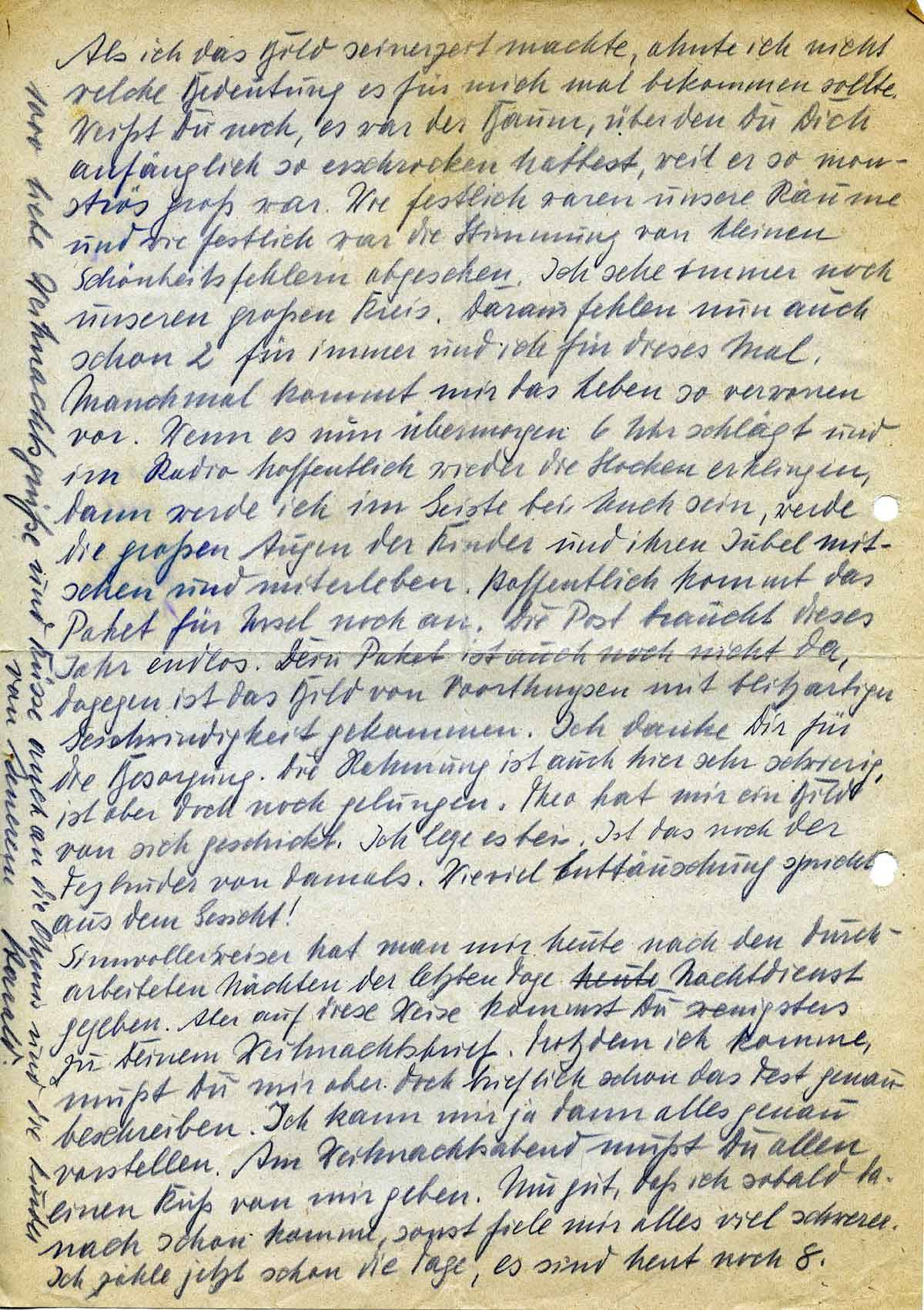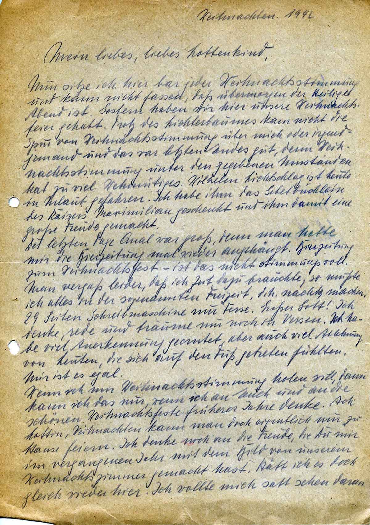 Sinnvollerweise hat man mir heute nach den durcharbeiteten Nächten der letzten Tage Nachtdienst gegeben. Aber auf diese Weise kommst Du wenigstens zu Deinem Weihnachtsbrief. Trotzdem ich komme, mußt Du mir aber doch brieflich schon das Fest genau beschreiben. Ich kann mir ja dann alles genau vorstellen. Am Weihnachtsabend mußt Du allen einen Kuß von mir geben. Nur gut, daß ich sobald danach schon komme, sonst fiele mir alles viel schwerer. Ich zähle jetzt schon die Tage, es sind heut noch 8.