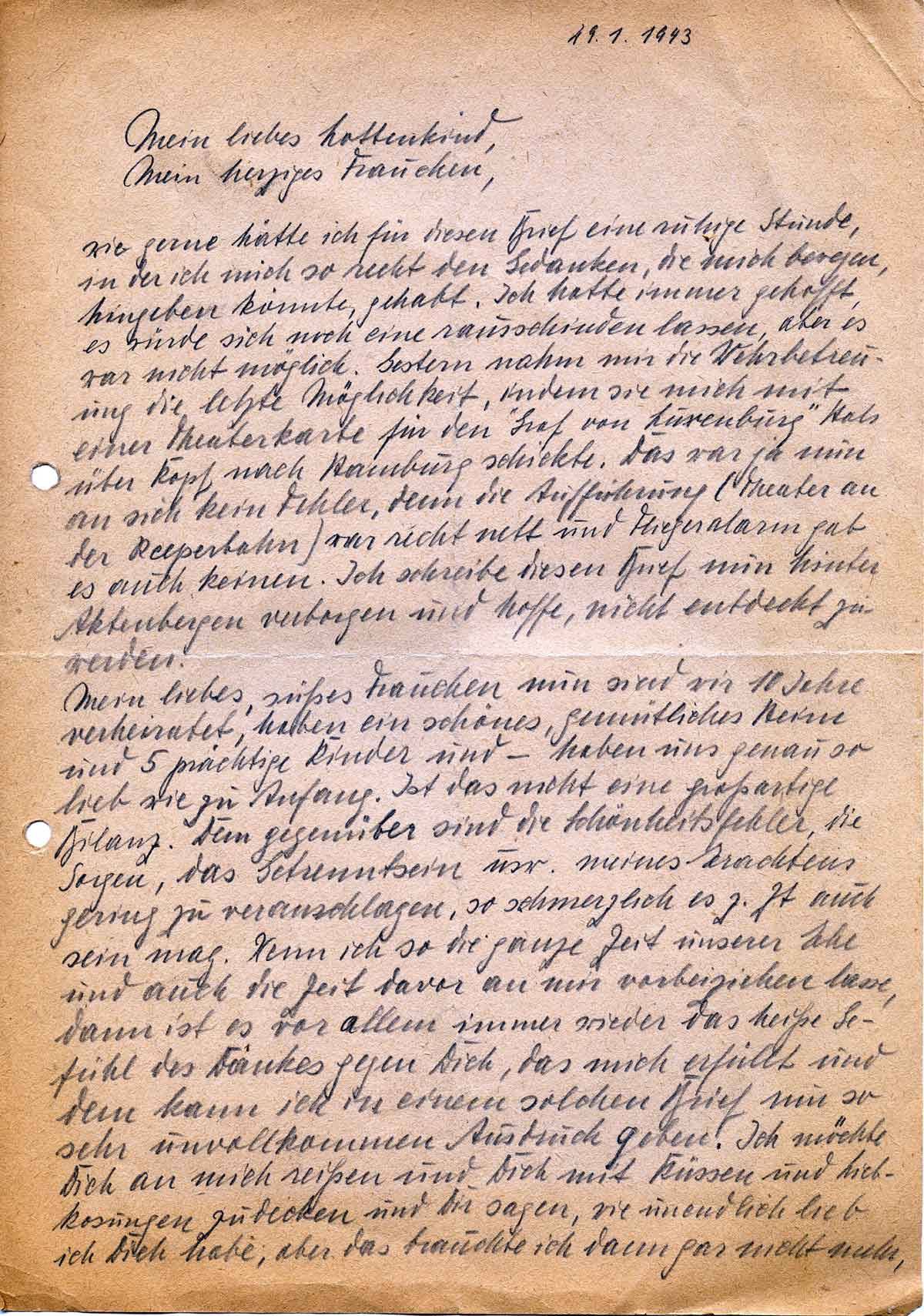 Mein liebes, süßes Frauchen nun sind wir 10 Jahren verheiratet, haben ein schönes, gemütliches Heim und 5 prächtige Kinder und - haben uns genau so lieb wie zu Anfang. Ist das nicht eine großartige Bilanz. Dem gegenüber sind die Schönheitsfehler, die Sorgen, das Getrenntsein usw. meines Erachtens gering zu veranschlagen, so schmerzlich ist z.Zt. auch sein mag. Wenn ich so die ganze Zeit unserer Ehe und auch die Zeit davor an mir vorbeiziehen lasse, dann ist es vor allem immer wieder das heiße Gefühl des Dankes gegen Dich, dass mich erfüllt und dem kann ich in einem solchen Brief nur so sehr unvollkommen Ausdruck geben. Ich möchte Dich an mich reißen und Dich mit Küssen und Liebkosungen zu decken und Dir sagen, wie unendlich lieb ich Dich habe, aber das brauchte ich dann gar nicht mehr,