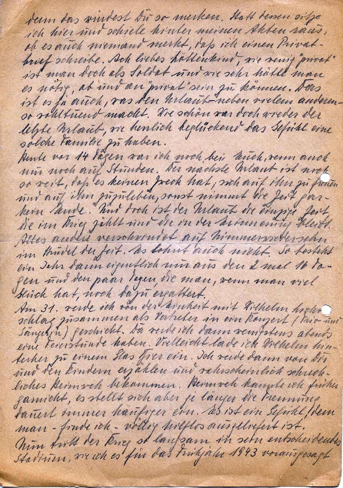 Am 31. werde ich von der Einheit mit Wilhelm Lichtschlag zusammen als Vertreter in ein Konzert (Trio und Sängerin) geschickt. Da werde ich dann wenigstens abends eine Feierstunde haben. Vielleicht lade ich Wilhelm hinterher zu einem Glas Bier ein. Ich werde dann von Dir und den Kindern erzählen und wahrscheinlich schreckliches Heimweh bekommen. Heimweh kannte ich früher garnicht, es stellt sich aber je länger die Trennung dauert immer häufiger ein. Es ist ein Gefühl, dem man – finde ich – völlig hilflos ausgeliefert ist.