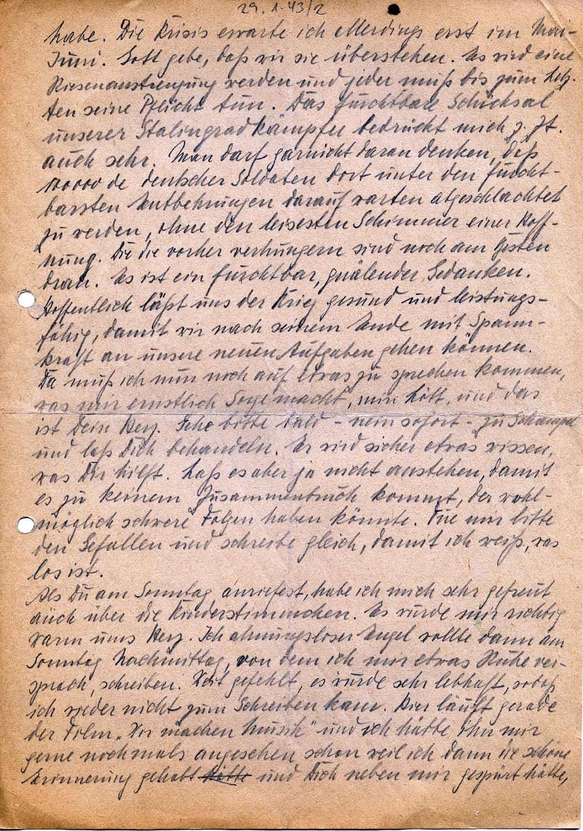 habe. Die Krisis erwarte ich allerdings erst im Mai -Juni. Gott gebe, dass wir sie überstehen. Es wird eine Riesenanstrengung werden und jeder muss bis zum Letzten seine Pflicht tun. Das furchtbare Schicksal unserer Stalingrad Kämpfer bedrückt mich z.Zt. auch sehr. Man darf garnicht daran denken, dass 100000de deutsche Soldaten dort unter den furchtbarsten Entbehrungen darauf warten abgeschlachtet zu werden, ohne den leisesten Schimmer einer Hoffnung. Die die vorher verhungern sind noch am Besten dran. Es ist ein furchtbar, quälender Gedanken. Hoffentlich lässt uns der Krieg gesund und leistungsfähig, damit wir nach seinem Ende mit Spannkraft an unseren neuen Aufgaben gehen können. Da muss ich nun noch auf etwas zu sprechen kommen, was mir ernstlich Sorgen macht, min Lött, und das ist Dein Herz. Gehe bitte bald – nein sofort – zu Schampel (=Hausarzt) und lass Dich behandeln. Er wird sicher etwas wissen, was Dir hilft. Lass es aber ja nicht anstehen, damit es zu keinem Zusammenbruch kommt, der womöglich schwere Folgen haben könnte. Tue mir bitte den Gefallen und schreibe gleich, damit ich weiß, was los ist.