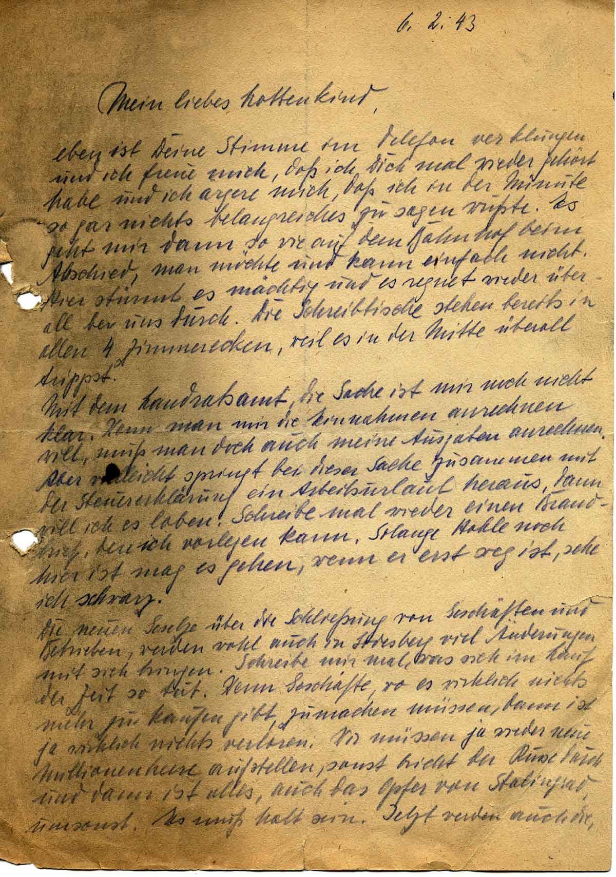 Die neuen Gesetze über die Schließung von Geschäften und Betrieben, werden wohl auch in Godesberg viel Änderung mit sich bringen. Schreibe mir mal, was sich im Lauf der Zeit so tut. Wenn Geschäfte, wo es wirklich nichts mehr zu kaufen gibt, zu machen müssen, dann ist ja wirklich nichts verloren. Wir müssen ja wieder neue Millionenheere aufstellen, sonst bricht der Russe durch und dann ist alles, auch des Opfer von Stalingrad, umsonst. Es muss halt sein. Jetzt werden auch die,
