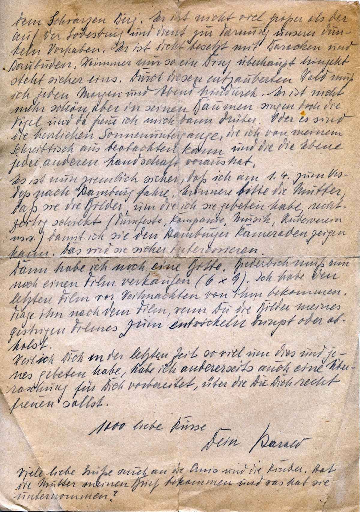 Es ist nun ziemlich sicher, dass ich am 1. 4. zum Vesdep nach Hamburg fahre. Erinnere bitte die Mutter, dass sie die Bilder, um die ich sie gebeten habe, rechtzeitig schickt (Turmfeste, Kompanie, Musik, Ruderverein usw.) damit ich sie den Hamburger Kameraden zeigen kann. Das wird sie sicher interessieren.
