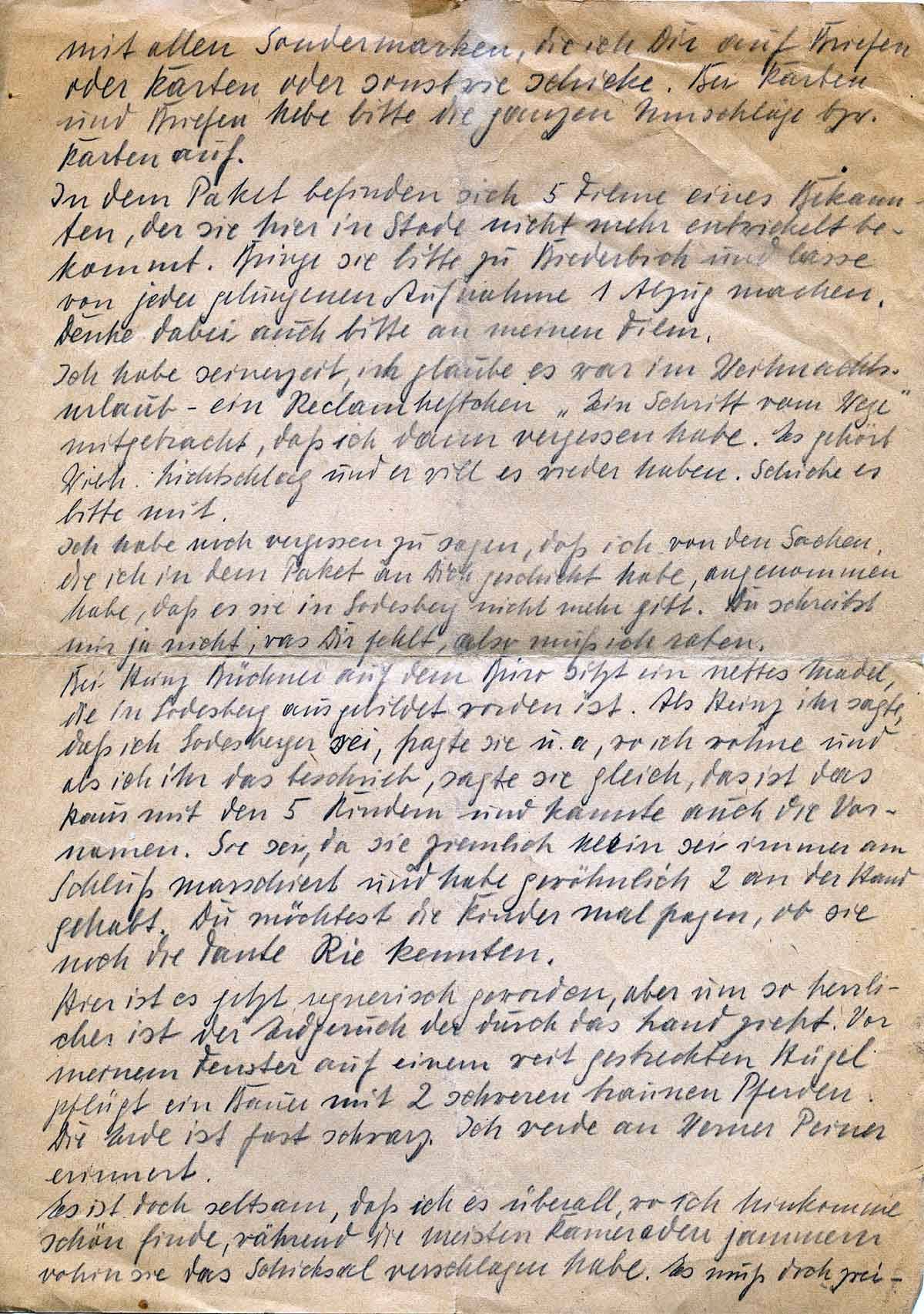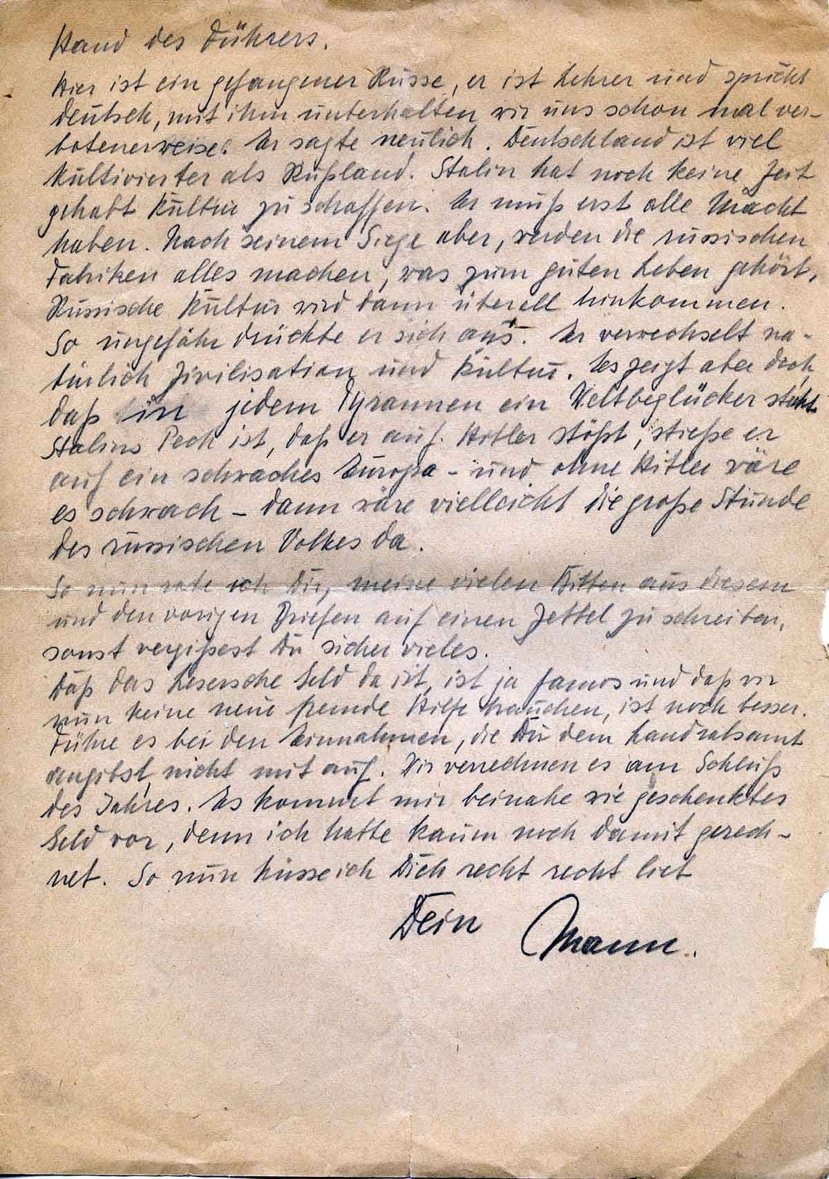 Hier ist ein gefangener Russe, er ist Lehrer und spricht Deutsch, mit ihm unterhalten wir uns schon mal verbotenerweise. Er sagte neulich, Deutschland ist viel kultivierter als Russland. Stalin hat noch keine Zeit gehabt Kultur zu schaffen. Er muss erst alle Macht haben. Nach seinen Siege aber, werden die russischen Fabriken alles machen, was zum guten Leben gehört. Russische Kultur wird dann überall hinkommen. So ungefähr drückte er sich aus. Er verwechselt natürlich Zivilisation und Kultur. Es zeigt aber doch, dass in jedem Tyrannen ein Weltbeglücker steckt. Stalins Pech ist, dass er auf Hitler stößt, stieße er auf ein schwaches Europa – und ohne Hitler wäre es schwach – dann wäre vielleicht die große Stunde des russischen Volkes da. So nun rate ich Dir, meine vielen Bitten aus diesem und den vorigen Briefen auf einen Zettel zu schreiben, sonst vergissest du sicher vieles.