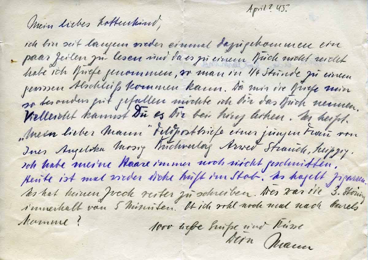 Ich bin seit langem wieder einmal dazu gekommen ein paar Zeilen zu lesen und da es zu einem Buch nicht reicht habe ich Briefe genommen, wo man in ¼ Stunde zu einem gewissen Abschluss kommen kann. Da mir die Briefe nun so besonders gut gefallen möchte ich Dir das Buch nennen. Vielleicht kannst Du es Dir bei Linz leihen. Es heißt “ Mein lieber Mann“ Feldpostbriefe einer jungen Frau von Ines Angelika Mosig Buchverlag Arwed Strauch, Leipzig.
