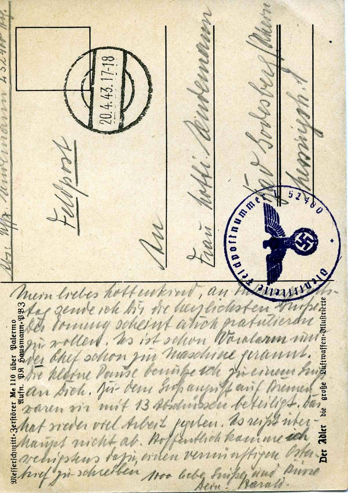 Mein liebes Lottenkind, an Führers Geburtstag sende ich Dir die herzlichsten Grüße. Der Tommy scheint auch gratulieren zu wollen. Es ist schon vor Alarm und der Chef schon zur Maschine gerannt. Die kleine Pause benutze ich zu einem Gruß an Dich. Bei dem Großangriff auf Bremen waren wir mit 13 Abschlüssen beteiligt. Das hat wieder viel Arbeit gegeben. Es reißt überhaupt nicht ab. Hoffentlich komme ich wenigstens dazu, einen vernünftigen Osterbrief zu schreiben