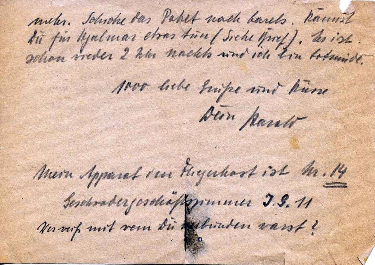 Dein erschreckender Brief ist mir unverständlich, denn ich habe 2 oder 3 Postkarten und einen kurzen Brief geschrieben. Zu mehr reicht die Zeit einfach nicht. Von dem Alarm im Ruhrgebiet habe ich kaum etwas gemerkt. Wir wurden über Duisburg Hannover geleitet und kamen erst um 2 Uhr in Jever an. Ich hatte auf einer Karte auch gebeten, mir meinen Rasierapparat und Pinsel zu schicken. Wäsche habe ich überhaupt keinen mehr. Bitte, bitte, bitte schicken Sie doch. Ich laufe hier rum wie ein Ferkel. Ich habe doch nur von jeder Sorte 3 Stück (unleserlich) Strümpfe, davon habe ich