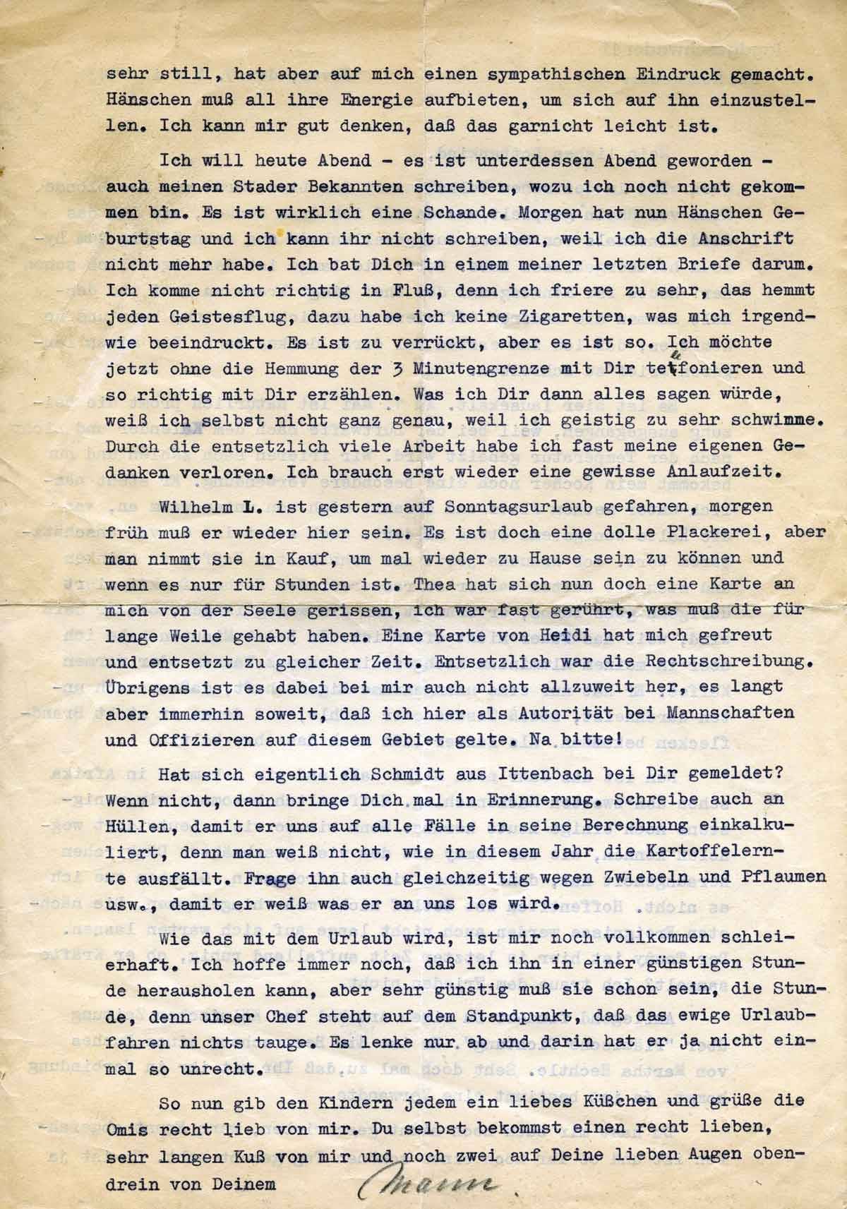 Hat sich eigentlich Schmidt aus Ittenbach bei Dir gemeldet? Wenn nicht, dann bringe Dich mal in Erinnerung. Schreibe auch an Hüllen, damit er uns auf alle Fälle in seine Berechnung einkalkuliert, denn man weiß nicht, wie in diesem Jahr die Kartoffelernte ausfällt. Frage ihn auch gleichzeitig wegen Zwiebeln und Pflaumen usw., damit er weiß was er an uns los wird.